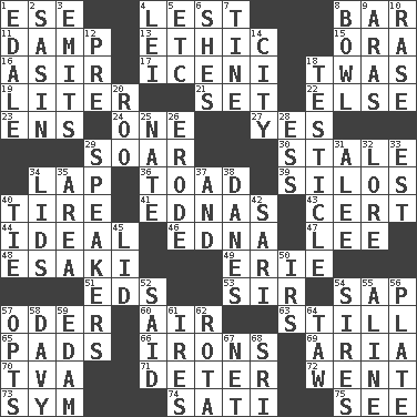 ACROSS 1. Compass dir. 4. For fear that 8. Long, evenly shaped piece 11. Moist 13. Value system 15. Mouth or opening 16. SW Saudi Arabia district 17. Ancient Celtic tribe of eastern Britain 18. It was, poetically 19. 61 cubic inches 21. Put into a specified state 22. Otherwise 23. Followers of ems 24. Single 27. Affirmative reply 29. Fly high 30. Lacking originality or spontaneity 34. Infant locale 36. Frog relative 39. Grain storage towers 40. Become fatigued 41. Ferber et al. 43. Sure thing 44. Perfect 46. Pulitzer Prize-winning author Ferber 47. Area sheltered from the wind 48. 1973 Nobel Price Winner (Physics) Leo 49. 4th largest of the Great Lakes 51. Begley and Asner 53. Title for a knight 54. Plant excrement 57. Baltic tributary 60. Wind 63. Free of sound 65. Groovy apts. 66. Metal shackles 69. Operatic vocal solo 70. Federal power corp. 71. Prevent from occurring 72. Left 73. Symbol (abbr.) 74. Suttee (variant) 75. Observe DOWN 1. Peak District village in England 2. Indian antelope 3. Sends forth 4. Luau accessory 5. And so on (abbr.) 6. "______ My Girl" (Turtles hit) 7. Prong on a fork 8. Soup holder 9. Ancient river in northeast Turkey 10. To erase 12. Before (prefix) 14. Municipality 18. A testis 20. Friend of Pooh 25. Nathan's nickname 26. Eat (away) 28. Curvy letter 29. Orators 31. Toward shelter 32. Old wives' tales, e.g. 33. Eastern Standard Time (abbr.) 34. Flaplike coverings 35. Length times width 37. Added to 38. Natives or inhabitants of Denmark 40. Standoff 42. Indian skirt 45. Hat (slang) 50. Big collection agency 52. Expressed in words 54. Founders of families 55. Place in a line 56. Food holder 57. Chooses 58. _ Jones' Locker 59. Dutch treat 61. Angers 62. Round or rotation of duties 64. The 23rd letter of the Hebrew alphabet 67. Fish or hair follower 68. _ Lanka