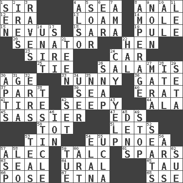 ACROSS 1. Title for a knight 4. At sea 8. Of or related to the anus 12. Period 13. Rich soil 14. Undercover agent 15. Mole, birthmark 18. "Two Mules for Sister ____" 19. Whine 20. Elected representative 22. Layer 23. Father 24. 4-wheeled motor vehicle 25. Standoff 26. Deli grouping 30. Ripen 33. Pet term 36. Yard entry 37. Role in a play 39. Ocean 40. Part of Q.E.F. 41. Become fatigued 42. Not well drained, as in land 44. Chicken ___ king 45. More lively and spirited 47. Begley and Asner 50. Small child 51. Allows 53. Metal container 54. Normal relaxed breathing 57. Actor Baldwin 59. Baby powder 61. Practice fights 63. Lick closed 64. Mountain range 65. The 19th letter of the Greek alphabet 66. Introduce or present, as a question 67. Inactive volcano in Sicily 68. Compass dir. DOWN 1. Elected rep. 2. Angers 3. All-night dance parties 4. In addition 5. Fly high 6. Ewer handle 7. Housemaid (var.) 8. Electrical Measurement 9. Part of speech 10. Everything 11. Area sheltered from the wind 16. A single undivided whole 17. Indian skirt 21. Adolescent 22. Actor Linden 24. Island 26. Fastener 27. Hindu Mythology: god of death 28. Slanted text style (abbr.) 29. Bristle 30. Flats, for short 31. Greek goddess of the earth (variant) 32. Blunders 34. One who uses or employs something 35. Born 38. One of the two male reproductive glands 42. Arrange properly for use 43. Sharp bark 46. Electrically charged atom 48. Hiding places for outlaws 49. Cease 52. Theater features 53. Afternoon social gatherings 54. Style 55. Southern CA. univ. 56. Ancient river in northeast Turkey 57. Cleo's killer 58. Lion 59. Third day of the wk. 60. Nonscientific branch of learning 62. Take to court