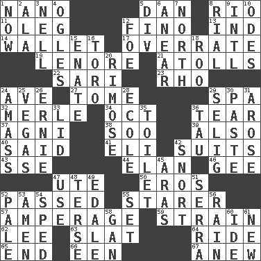 ACROSS 1. Billionth: prefix 5. One of the 12 tribes of Israel 8. _ de Janeiro 11. Cassini of fashion 12. Fine (Spanish) 13. Indiana (abbr.) 14. Place for singles 17. Make much ado about nothing 19. Poe poem 21. Ringlike coral islands and reefs 22. Indian skirt 23. 17th letter of the Greek alphabet 24. "___ Maria" 27. Heavy book 29. Health resort 32. Haggard of country music 34. Sep. follower 36. Pull apart 37. Hindu god of fire 38. "Barney Miller" actor Jack 39. In addition 40. Alleged 41. Connecticut Ivy Leaguer 42. Costumes for special activities 43. Compass dir. 44. Style 46. Unit of force equal to gravity 47. Shoshoni 50. Greek god of love 52. Went by 55. A viewer who gazes fixedly 57. Electrical Measurement 59. Put through a sieve 62. Area sheltered from the wind 63. Narrow board 64. Travel on an animal 65. Conclusion 66. Car or cant ending 67. Afresh DOWN 1. Immediately 2. Chicken ___ king 3. 1994 drama film starring Jodie Foster 4. Stares at amorously 5. HTML Container Element 6. Approach 7. _ pole 8. Monetary unit of Yemen 9. International (abbr.) 10. Lyric poems 12. Enemy 15. Related on the mother's side 16. "Corrida" creature 18. Friend of Pooh 20. Full of chinks, cracks, or crevices 24. Collect or gather 25. Viva Las _ 26. Bert's buddy 28. Learning spot: Fr. 29. Major League Baseball Commissioner Bud 30. Thick mixture 31. Came up 33. Hat (slang) 35. Bathroom plumbing fixture 36. The 19th letter of the Greek alphabet 42. Derisive sound 45. Ancient river in northeast Turkey 47. Purpose 48. Laconic 49. Peak District village in England 51. Father Junipero _ 52. Light colored 53. So be it 54. Drove too fast 55. Arrange properly for use 56. Precipitation 58. Separate the seeds from cotton 60. Binary compound 61. ___ Haven, CT