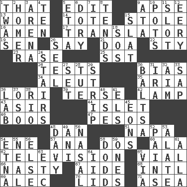 ACROSS 1. Not this but _ 5. Prepare for publication 9. Domed church section 13. Had on 14. Carry 15. Took without asking 16. So be it 17. Interpreter 19. Elected rep. 20. Declare 21. ___ good deed 22. Filthy place 23. Raze (variant) 25. Fast jet (abbr.) 26. Trials 30. Prejudice 34. Native American of Southwest Alaska 35. Roberta Peters solo 36. Australian parrot (variant) 39. Laconic 42. Desk light 43. SW Saudi Arabia district 44. Small island 46. Scornful sounds 47. Mexican monetary units 48. Daniel's nick name 51. California wine valley 54. Compass dir. 57. Santa ___, CA 58. Two (Sp.) 60. In the manner of 62. Boob tube 65. Small bottle 66. Offensive 67. Helper 68. International (abbr.) 69. Actor Baldwin 70. Hats (slang) 71. Toward the sea DOWN 1. It was, poetically 2. Homing pigeon 3. Sports stadium 4. "___ Little Indians" 5. Singer James 6. Dinghy 7. Call ___ day 8. Looks after 9. "One Day ___ Time" 10. Plant holders 11. Narrow opening 12. Suggestive of the supernatural 15. Narrow board 18. Mayday 20. Stitch closed the eyes of (a falcon) 24. Flight of steps 27. Put into a specified state 28. Third day of the wk. 29. Empty completely 30. Greek mezzo-soprano Agnes 31. Lyricist Gershwin 32. Direct toward a target or goal 33. Plant excrement 36. Experiment locale 37. Bear (Spanish) 38. River (Sp.) 40. Compass dir. 41. Raised railways 45. Immeasurably long periods of time 48. American folk hero Crockett 49. Black tropical American cuckoo 50. Rhinal 52. Aches 53. Having winglike extensions 54. Inactive volcano in Sicily 55. Be tempered by heat 56. Otherwise 58. Texas town _ City 59. Washington bills 61. Silent film actress Nazimova 63. And so on (abbr.) 64. One more than two 65. By way of