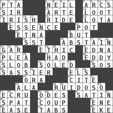 ACROSS 1. Parent Teacher Assoc. 4. Famous astronaut Armstrong 8. Curves 12. Title for a knight 13. Johnson of "Laugh-In" 14. Plunder 15. From or relating to Ireland 18. Travel on an animal 19. Globular water bottle used in Asia 20. Core 22. Plant holder 23. Inactive volcano in Sicily 24. Yet 25. Fast jet (abbr.) 26. Refrain by choice 30. Slender fish 33. Principle of right and wrong 36. Pulitzer Prize-winning author Ferber 37. Entreaty 39. Possessed 40. Whirlpool 41. Messy guy 42. Having a sole or soles 44. Distress signal 45. More disrespectful 47. Raised railways 50. Mouth or opening 51. Quote 53. Chicken ___ king 54. Noisy, rowdy, vocal (Spanish) 57. Shade of tan 59. Lyric poems 61. Smooth fabric 63. Petty quarrel 64. Overturn; upset 65. Compass dir. 66. Comfort 67. Bar bills 68. Supplement with great effort DOWN 1. 23rd letter of the Greek alphabet 2. Hoop that covers a wheel 3. Ascend 4. Drug cop 5. One of the Great Lakes 6. It would 7. Area sheltered from the wind 8. One to whom something is allotted 9. Carrot, for example 10. Small bed 11. R.R. building 16. Fast planes 17. Coop moms 21. Nathan's nickname 22. Suppuration 24. English channel? 26. Assistant 27. Sums up 28. _ china 29. Negative votes 30. Global Positioning Systems (abbr.) 31. Silent film actress Nazimova 32. Vintage cars 34. Son of Odin 35. Actor Linden 38. Utter; complete 42. Ocean 43. Tenth: prefix 46. Lyricist Gershwin 48. Flaplike coverings 49. Portico 52. First name in cosmetics 53. Ancient river in northeast Turkey 54. Reuben's nickname 55. United States Postal Service (abbr.) 56. Pig sound 57. Compass dir. 58. Numbers guy (abbr.) 59. Sep. follower 60. ___ good deed 62. Born