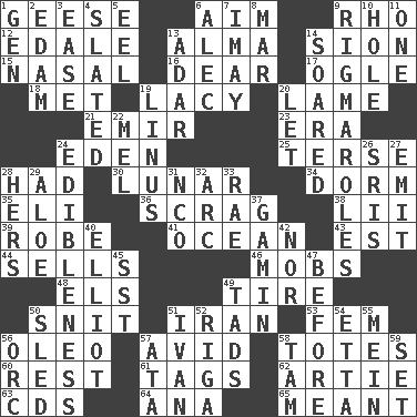 ACROSS 1. Honkers 6. Direct toward a target or goal 9. 17th letter of the Greek alphabet 12. Peak District village in England 13. _ mater 14. The Jewish people; Israel 15. Rhinal 16. Letter starter 17. Stare 18. Was introduced to 19. Made of lace 20. Unable to walk 21. Independent ruler or chieftain 23. Epoch 24. Locale of original sin 25. Laconic 28. Possessed 30. Type of eclipse 34. Dormintory (informal) 35. Connecticut Ivy Leaguer 36. Lean end of the neck 38. Cards in a Roman deck? 39. Loose flowing garment 41. Sea 43. Eastern Standard Time (abbr.) 44. Exchanges for money 46. Disorderly crowds 48. Raised railways 49. Hoop that covers a wheel 50. In a ____ (agitated or irritated) 51. SW Asia republic 53. Opposite of masc. 56. Margarine 57. Enthusiastic 58. Hauls 60. Relief 61. Labels 62. Nick name for Arthur 63. Music discs 64. Santa ___, CA 65. Intended DOWN 1. Commissioned military rank (abbr.) 2. Dutch treat 3. Comfort 4. Scheduled 5. Snakelike fish 6. Actor Baldwin 7. "If ____ say so..." 8. Third mo. 9. Frustrating wastes of time 10. Hollow 11. Single 13. The sixth month of the Jewish calendar 14. Flew 19. "_ and Lucy" (Charlie Brown theme song) 20. Allow 22. Cartoonist voice _ Blanc 24. The property of being fit to eat 26. Indian titles of respect 27. Send forth 28. Possessive pronoun 29. _ vera 31. Non-commissioned officer (abbr.) 32. Curve 33. Actress Charlotte 37. Street urchin 40. American author Paul (1891-1958) 42. And not 45. Fast jet (abbr.) 47. Prior to 49. Bits 50. Downhill vehicle 51. "Terrible" tsar 52. Port city in Latvia 54. Singer James 55. Count _ (2 wds.) 56. The grampus (Milton) 57. "One Day ___ Time" 58. Scottish cap 59. Arrange properly for use