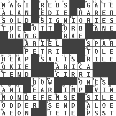 ACROSS 1. Wise men 5. Confederate soldiers (slang) 9. Yard entry 13. ____ Jay Lerner 14. Singer Brickell 15. More valued for its uncommonness 16. Exchanged or delivered for money 17. Seigniories (variant) 19. Third day of the wk. 20. Baseball player Mel 21. Globe 22. A saturated hydrocarbon 23. Mild oath, euphamism for damn 25. Actress Charlotte 26. Satellite of Uranus 30. Coast Guard woman 34. _ dish (used to culture cells) 35. Lacquered or enameled metalware 36. Pile 39. Table seasonings 42. Cause heat under the collar 43. Migrant worker of the '30s 44. N. Chile seaport 46. Watch over 47. High-altitude cloud 48. Arrow shooter 51. Singles 54. Cuckoo 57. Ewer handle 58. Mischievous child 60. Zeal 62. Unrelated to defense, as in spending 65. Filth; sediment 66. More peculiar 67. Post 68. Medicinal plant 69. Period of immesurable duration 70. Wig 71. Inconspicuous attention getter DOWN 1. Vertical spar for supporting sails 2. Verbally 3. An organ shaped like a helmet 4. Indiana (abbr.) 5. Respite 6. Prepare for publication 7. Large 8. Sir (Sp.) 9. Slender fish 10. Roberta Peters solo 11. Adolescent 12. Celtic language 15. Loose flowing garment 18. Retirement account (abbr.) 20. Legendary monster 24. Slept 27. ___ a Wonderful Life 28. Period 29. Pale purple color 30. Put through a sieve 31. Luau course 32. 100% 33. To separate or throw off 36. Being at a high temperature 37. Make supply last 38. The 18th letter of the Arabic alphabet 40. Three (prefix) 41. Title for a knight 45. Riding implement 48. Fermented drink made from hops 49. Clumsy lout 50. Obtain by seizing forcibly or violently 52. Vices 53. Grain storage towers 54. Small Philippine buffalo 55. Connecting point 56. Southeast Asian peninsula 58. Is not 59. Ancient Persian 61. Confront 63. Lair 64. Born 65. Plant excrement