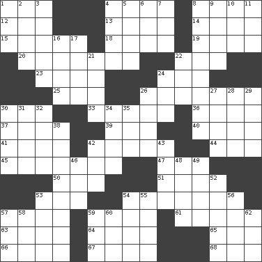 ACROSS 1. E Mali city 4. Goddess of spring and wife of Bragi 8. Plant excrements 12. Chief or king in Benin or Nigeria 13. Assign a rank or rating to 14. Ballerina skirt 15. Thick mixture 18. Afresh 19. ____ Bator, Mongolia 20. Lacerating 22. Find the sum of 23. Stricken, poetically 24. Single 25. Perceive with the eye 26. Hard copy producer 30. Call ___ day 33. Mysterious quality of enchantment 36. Falsehood 37. Hindu Mythology: god of death 39. Hit sharply and swiftly 40. Comedian Laurel of Laurel & Hardy 41. Demure 42. More valued for its uncommonness 44. Working for oneself (abbr.) 45. Paper fasteners 47. Retirement account (abbr.) 50. Sight organ 51. For fear that 53. "We ___ not amused" (Victoria) 54. Orator 57. Inactive volcano in Sicily 59. Jai _ 61. The wife of a rajah (variant) 63. Toadlike animal 64. Become fatigued 65. Pull behind 66. Prong on a fork 67. Opinion 68. Compass dir. DOWN 1. Grand Old Party 2. Blind as ____ 3. Fertile tracts in a desert 4. SW Asia republic 5. Mild oath, euphamism for damn 6. Shoshoni 7. ___ Haven, CT 8. SAT takers 9. Old (Scot.) 10. Parent Teacher Assoc. 11. Player for Phoenix 16. Scottish caps 17. 4th largest of the Great Lakes 21. A whole individual unit 22. Black tropical American cuckoo 24. The grampus (Milton) 26. Corncob 27. Jacques of French films 28. Enthusiasm 29. Tear apart 30. Naughty children 31. Small pie 32. Operatic vocal solo 34. Ancient river in northeast Turkey 35. Slender fish 38. Electrical Measurement 42. Portuguese money of account (variant) 43. Cause heat under the collar 46. Potassium hydroxide 48. Buttocks 49. "____ silly question..." 52. Portable shelters 53. At once, immediately (arch.) 54. Indian skirt 55. Sliced desserts 56. Vintage cars 57. Lizard (obsolete) 58. Three (prefix) 59. _ moment's notice (2 wds.) 60. 54 in ancient Rome 62. She-sheep