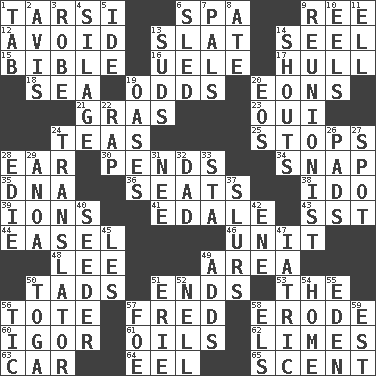 ACROSS 1. Tarsus (plural) 6. Health resort 9. To sift 12. Keep away from 13. Narrow board 14. Sew up the eyelids of hawks and falcons 15. God's Word 16. Ubangi River tributary 17. Frame or body of a ship 18. Ocean 19. Probability 20. Immeasurably long periods of time 21. Pate de foie ____ 23. Fr. "Yes" 24. Beverages made from leaves 25. Closes up, plugs up 28. Ewer handle 30. Hangs 34. Fastener 35. Heredity factor (abbr.) 36. Theater features 38. Wedding promise 39. Charged particles 41. Peak District village in England 43. Fast jet (abbr.) 44. Artist's stand 46. A single undivided whole 48. Area sheltered from the wind 49. Type of rug 50. Bits 51. Conclusions 53. Definite Article 56. Haul 57. Flintstone 58. Wear away 60. Composer Stravinsky 61. Lubricates 62. Citrus fruits 63. Automobile 64. Snakelike fish 65. Aroma DOWN 1. Keyboard key 2. Deliberation 3. Loose flowing garment 4. Fodder prepared in a silo 5. Binary compound 6. Downhill vehicle 7. Friends 8. Had dinner 9. One who advocates reunion 10. Snakelike fish 11. Pipe bend 13. Soap bubbles 14. Yells 19. Fertile tracts in a desert 20. Greek goddess of the dawn 22. Strike 24. Interpreter 26. Writing tablets 27. Specific locale 28. Singer Brickell 29. Small Philippine buffalo 31. Born 32. Male parent 33. R.R. building 37. Plays smoothly or legato 40. Sowing specialist 42. Compass dir. 45. French article 47. Of or pertaining to medicine 49. Sums up 50. Ancient Roman robe 51. One of the Great Lakes 52. 1994 drama film starring Jodie Foster 54. Residence 55. Locale of original sin 56. Nervous spasm 57. Enemy 58. Raised railways 59. Eastern Standard Time (abbr.)