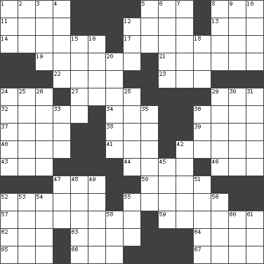 ACROSS 1. Scornful sounds 5. Had dinner 8. Bear (Spanish) 11. Object of repulsion 12. SW Asia republic 13. Tired old horse 14. Cause to be 17. One of the two male reproductive glands 19. Sounds asleep 21. Cylindrical with tapered ends 22. Play the lead 23. Period 24. A female animal or person 27. Smallest unit of an element 29. Health resort 32. Relating to the nose 34. Small moist lump or mass 36. Prejudice 37. Northwest Algerian city 38. Compass dir. 39. High mountains 40. Libertine 41. Lair 42. An organ shaped like a helmet 43. Three (prefix) 44. Russian ruler of old 46. _ Lanka 47. Nanny (var.) 50. Mouths or openings 52. Declaimed 55. More lacking in sense or substance 57. Conveyance 59. Put through a sieve 62. Followers of ems 63. Round or rotation of duties 64. Travel on an animal 65. Friend of Pooh 66. Eastern Standard Time (abbr.) 67. Afresh DOWN 1. English channel? 2. Rowing implement 3. Singles 4. Actors Connery and Penn 5. "We ___ not amused" (Victoria) 6. Clothes sense 7. Keyboard key 8. Single time 9. Table seasoning 10. Double curve, resembling the letter S 12. It is 15. Add up to 16. Part of Q.E.F. 18. Lyricist Gershwin 20. Worn away 24. Derisive sound 25. Ethiopian city, capital of Harari 26. 1973 Nobel Price Winner (Physics) Leo 28. French painter Edouard 29. Beverly of Met fame 30. Some stationery 31. Slender Brazilian palm 33. A saturated hydrocarbon 35. Gillaume's butler role 36. Sound made by sheep 42. Monetary aid 45. Ancient river in northeast Turkey 47. "One Day ___ Time" 48. Distance measurement (Brit.) 49. Goodbye (Sp.) 51. Spanish missionary in California 52. Baltic tributary 53. Western Nevada city 54. In addition 55. _ tizzy (2 wds.) 56. Water falling in drops from the sky 58. Baseball player Mel 60. Binary compound 61. ___ Haven, CT