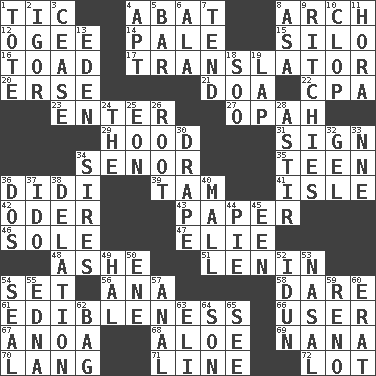 ACROSS 1. Nervous spasm 4. Blind as ____ 8. Bowlike part 12. Double curve, resembling the letter S 14. Light colored 15. Grain storage tower 16. Frog relative 17. Interpreter 20. Celtic language 21. ___ good deed 22. Numbers guy (abbr.) 23. Keyboard key 27. Brightly colored fish 29. Parka part 31. Omen 34. Sir (Sp.) 35. Adolescent 36. "You Light Up My Life" star Conn 39. Scottish cap 41. Small island 42. River in Europe 43. Some stationery 46. Not divided or shared with others 47. Writer Wiesel 48. American tennis player Robert 51. Soviet premier 1918-24 54. Arrange properly for use 56. Santa ___, CA 58. Have the gumption 61. The property of being fit to eat 66. One who uses or employs something 67. Small Philippine buffalo 68. _ vera 69. Grandmother 70. Long (Scottish) 71. Actor's bit 72. Car dealer's back yard DOWN 1. Lug 2. Russian composer Stravinsky 3. Desist 4. Fitting 5. Long, evenly shaped piece 6. Chicken ___ king 7. Look after 8. White ___ sheet 9. Actors Guy, Robert Welles, and Clint 10. Hoof sound 11. Israeli folk dance 13. Locale of original sin 18. "Barney Miller" actor Jack 19. Pet locale 24. Definite Article 25. Period of immesurable duration 26. Carrot, for example 28. Moving about 30. Window treatment 32. Set 33. Compass dir. 34. Titles for men of rank and authority 36. Two (Sp.) 37. Wedding promise 38. Accusation by an informer 40. Shopping center 44. Sliced dessert 45. Car or cant ending 49. Actor Linden 50. Compass dir. 52. Goddess of spring and wife of Bragi 53. Relating to the nose 54. Lick closed 55. Pulitzer Prize-winning author Ferber 57. Of or related to the anus 59. Western Nevada city 60. Part of Q.E.F. 62. Paper or plastic container 63. Biblical high priest 64. Manchild 65. Observe