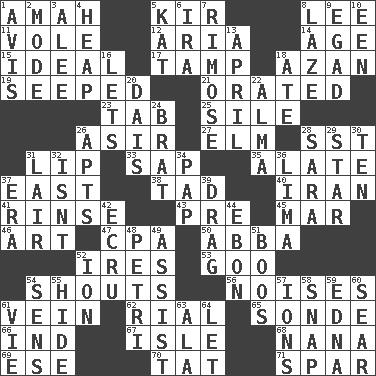 ACROSS 1. Housemaid 5. Apertif with cassis 8. Area sheltered from the wind 11. Short-tailed, large-bodied rat 12. Operatic vocal solo 14. Personal question 15. Perfect 17. Pack (down) 18. Muslim summons to prayer 19. Oozed 21. Spoke pompously 23. Bar bill 25. Drop; flow; fall 26. SW Saudi Arabia district 27. Shade tree 28. Fast jet (abbr.) 31. Mouth edge 33. Plant excrement 35. Having winglike extensions 37. Compass direction 38. Bit 40. SW Asia republic 41. Wash lightly 43. Before (prefix) 45. Make imperfect 46. Nonscientific branch of learning 47. Numbers guy (abbr.) 50. Swedish rock group 52. Angers 53. Thick or sticky substance 54. Yells 56. Annoying sounds 61. Distinctive style or manner 62. Monetary unit of Yemen 65. Message 66. Indiana (abbr.) 67. Small island 68. Nanny 69. Compass dir. 70. Make lace 71. Coast Guard woman DOWN 1. Opinion 2. Method 3. Toward shelter 4. Pile 5. Krazy ___ of comics 6. Retirement account (abbr.) 7. Full of chinks, cracks, or crevices 8. Goldbrick 9. Mild oath 10. Car or cant ending 13. Showery time 16. Allows 18. Had dinner 20. Raised platform 22. _ mater 24. Naughty child 26. Tenement units (abbr.) 28. "Two Mules for Sister ____" 29. Play the lead 30. "___ Little Indians" 31. Den 32. Is not 34. Infant food 36. Pale green bean 37. Epoch 39. To trail on the ground 42. Shade of tan 44. Inky black, to poets 48. _ dish (used to culture cells) 49. Help 51. Expressions of contempt or scorn 52. Electrically charged atom 54. Elected reps. 55. Flintstone garb 57. Charged atoms 58. Fastener 59. Pulitzer Prize-winning author Ferber 60. Wither 61. Compete 63. Insect wing 64. Allow