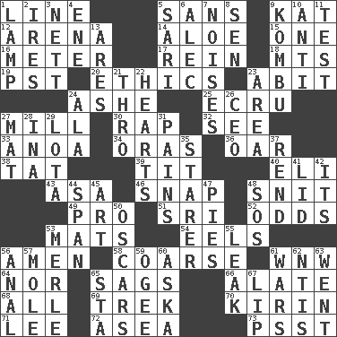 ACROSS 1. Actor's bit 5. Without 9. Krazy ___ of comics 12. Sports stadium 14. _ vera 15. Single 16. Distance measurement 17. It's straight from the horse's mouth 18. Mountains (abbr.) 19. Pacific Standard Time (abbr.) 20. Principles of right and wrong 23. "This won't hurt ____!" 24. American tennis player Robert 25. Shade of tan 27. Place where flour is made 30. Reproach for some lapse or misdeed 32. Observe 33. Small Philippine buffalo 34. Mouths or openings 36. Boat paddle 38. Make lace 39. Teat (slang) 40. Connecticut Ivy Leaguer 43. White ___ sheet 46. Fastener 48. In a ____ (agitated or irritated) 49. Adept person 51. _ Lanka 52. Likelihood 53. Floor protectors 54. Snakelike fish 56. So be it 58. Rough 61. Compass dir. 64. And not 65. Settles 66. Having winglike extensions 68. 100% 69. Long journey 70. Japanese brewing company 71. Area sheltered from the wind 72. Toward the sea 73. Inconspicuous attention getter DOWN 1. Desk light 2. Angers 3. Remaining after all deductions 4. Compass dir. 5. Indian skirt 6. Actor Baldwin 7. Annoying sounds 8. Elected rep. 9. Dried seaweed eaten as food 10. Against 11. Trial 13. Ancient Greek god of war 21. Through, poetically 22. Centers 23. Length times width 24. Wing 26. Corporate head (abbr.) 27. Floor covering 28. _ tizzy (2 wds.) 29. Globular water bottle used in Asia 31. Aches 35. A viewer who gazes fixedly 37. Tear apart 41. Hat (slang) 42. It is 44. Connect, as a bridge 45. Tate display 47. Sliced desserts 48. Distress signal 50. Motion picture awards 53. Haggard of country music 55. Path through which fluid escapes 56. Of or related to the anus 57. Undercover agent 59. Double curve, resembling the letter S 60. "____ silly question..." 61. Armed conflicts 62. Nuclear Threat Initiatives 63. Gone 65. R.R. building 67. Mouth edge