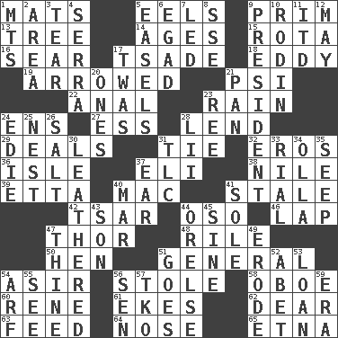 ACROSS 1. Floor coverings 5. Snakelike fish 9. Demure 13. Woody plant 14. Grows older 15. Round or rotation of duties 16. Wither 17. Sadhe (variant) 18. Whirlpool 19. Moved like an arrow 21. Air pressure measure (abbr.) 22. Of or related to the anus 23. Precipitation 24. Followers of ems 27. Curvy letter 28. Grant temporary use of 29. Allots cards 31. Standoff 32. Greek god of love 36. Capri or Wight 37. Connecticut Ivy Leaguer 38. The longest river in the world 39. Singer James 40. Big _ 41. Lacking originality or spontaneity 42. Russian ruler of old 44. Bear (Spanish) 46. Pet locale 47. Son of Odin 48. Cause heat under the collar 50. Layer 51. Commissioned military rank 54. SW Saudi Arabia district 56. Took without asking 58. Mitch Miller's instrument 60. French philosopher Descartes 61. Makes supply last 62. Letter starter 63. Nourish 64. Olfactory organ 65. Inactive volcano in Sicily DOWN 1. Mountains (abbr.) 2. Type of rug 3. Pull into pieces 4. Spanish missionary in California 5. Artist's stands 6. Mild oath 7. Directed 8. Compass dir. 9. Elected leader of a country 10. "The Thinker" sculptor 11. It would 12. Fifth month 17. It was, poetically 20. Singles 21. Baking dish 23. To sift 24. Singer Brickell 25. Egg locale 26. Table seasoning 28. Cards in a Roman deck? 30. Tough but pliablecoriaceous 31. Affectionate concern, for short 33. Monetary unit of Yemen 34. Rounded earthenware pot or jar 35. Ooze 37. Ewer handle 40. Make imperfect 41. Flatfish 43. Male offspring 44. Threatening words 45. Trig term 47. One or ones belonging to thee 49. Wear away 51. Leaves 52. Collude with 53. Grant temporary use of 54. Sandy's bark 55. Perceive with the eye 56. Elected rep. 57. Ring climax 59. Period