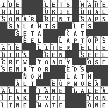 ACROSS 1. Binary compound 4. Allows 8. Female horse 12. To free from 13. Migrant worker of the '30s 14. Mountain range 15. Echolocation 18. Monthly bill 19. Plant excrements 20. Deli grouping 22. French article 23. Bristle 24. Feline 25. Snakelike fish 26. Portable computers 30. Had dinner 33. 61 cubic inches 36. Writer Wiesel 37. Auction offers 39. Commissioned mil. rank 40. Sew up the eyelids of hawks and falcons 41. Group working together 42. Sycophant 44. Order of Saint Francis (abbr.) 45. Elected representative 47. Begley and Asner 50. Immediately 51. Thin strip of wood or metal 53. The first octave above the treble staff 54. Normal relaxed breathing 57. Silent film actress Nazimova 59. Docile 61. An organ shaped like a helmet 63. Path through which fluid escapes 64. Tending to cause great harm 65. Electrically charged atom 66. Actor's bit 67. Nathan's nickname 68. Single DOWN 1. Big collection agency 2. "Vaya con ____" 3. Ferber et al. 4. Australian parrot (variant) 5. Supplements with great effort 6. Shallow baking pan 7. Put into a specified state 8. French bagpipes 9. Ancient river in northeast Turkey 10. Strike 11. Raised railways 16. Toward shelter 17. Pace 21. Shopping center 22. Pet locale 24. Auto 26. Grant temporary use of 27. Margarine 28. Sliced desserts 29. Oneself 30. Lettered men learn these first 31. Hoop that covers a wheel 32. Locale of original sin 34. Russian composer Stravinsky 35. Beverage made from leaves 38. Tchaikovsky ballet 42. Pull behind 43. Sharp bark 46. Small child 48. Mild oath, euphamism for damn 49. Portico 52. Sun: prefix 53. Actor Alda or Thicke 54. Give off 55. Ubangi River tributary 56. Period of immesurable duration 57. Everything 58. Flowery wreath 59. "___ Little Indians" 60. Actress Gardner 62. One (Scot)