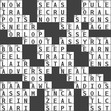 ACROSS 1. Immediately 4. Oceans 8. Whimper 12. Retirement account (abbr.) 13. Shade of tan 14. Spoken 15. Cooking vessels 17. Brief written record 18. Signals 19. Scornful expression 21. Ocean 23. Grow older 24. Fourth or lowest deck 26. Compass dir. 28. Lowest support of a structure 30. Nineveh was its capital 34. English channel? 37. Ooze 39. Merit 40. Snakelike fish 41. Distinguishing feature 43. Make lace 44. Den 46. Play the lead 47. Followers of ems 48. Contrary to your interests or welfare 51. Be tempered by heat 54. Greek goddess of the dawn 55. Talk or behave amorously 58. Sound made by sheep 61. Leather borer 63. Goodbye (Sp.) 65. Indian state 67. South American Indian 71. Not divided or shared with others 72. It's straight from the horse's mouth 73. Ardor 74. Affectionate concern, for short 75. Indian skirt 76. Back-to-school mo. 77. Fast jet (abbr.) DOWN 1. Cuts off 2. U. of Maine site 3. Wetness 4. Elected rep. 5. Environmental prefix 6. Nonscientific branch of learning 7. Institutes legal proceedings 8. Luau course 9. Capital and largest city of Mongolia 10. Austrian-born American filmmaker Fritz 11. Otherwise 16. Automatic 18. Backtalk 20. Friend of Pooh 22. Double-curved letter 25. Mail 27. Sight organ 29. Laconic 30. Bee-related 31. Pace 32. SW Asia republic 33. Pismires 34. Actor Lugosi 35. Necklace unit 36. 154 in Roman numerals 38. Ingest 42. Unclean, religiously 45. To sift 49. Wander 50. Compass dir. 52. In the manner of 53. Hats (slang) 56. Disturbances 57. For Whom the Bell _____ 58. Long, evenly shaped pieces 59. At sea 60. SW Saudi Arabia district 62. Belonging to Elizabeth 64. Religious group 66. Black tropical American cuckoo 68. Born 69. Head covering 70. The first octave above the treble staff