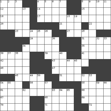 ACROSS 1. ___ Haven, CT 4. Singer James 8. At sea 12. Mitch Miller's instrument 14. Supplemented with great effort 15. Be tempered by heat 16. Implement 17. Unrelated to defense, as in spending 20. Extremities 21. "Barney Miller" actor Jack 22. Had dinner 23. Former Milwaukee Brewers owner Bud 27. Egg locale 29. Goddess of spring and wife of Bragi 31. Airs 34. Honkers 35. Type of rug 36. Swedish rock group 39. Attempt 41. Russian ruler of old 42. Rich soil 43. Viva Las _ 46. Event scenes 47. Enthusiasm 48. Leg joint 51. Cabin 54. Eastern Standard Time (abbr.) 56. Lair 58. Hereditary estate 61. Interpreter 66. Queen of England 1702-14 67. "Death on the ____" 68. Grandmother 69. Floor protectors 70. "____ silly question..." 71. Double curve, resembling the letter S 72. Be seated DOWN 1. Make mention of 2. Inky black, to poets 3. Forest 4. Car or cant ending 5. Ring climax 6. "___ Little Indians" 7. Does sums 8. A saturated hydrocarbon 9. Elected representatives 10. Compass direction 11. Toward shelter 13. Otherwise 18. Period of immesurable duration 19. Enemy 24. Falsehood 25. Binary compound 26. Abrupt rush of wind 28. Arguments over trivial matters 30. Effrontery 32. Ocean 33. Ewer handle 34. Homeless child 36. 100% 37. Oct. 31 cry 38. Sass 40. Shout 44. E Mali city 45. Also 49. Begley and Asner 50. Snakelike fish 52. Island territory of the United States 53. Ferber et al. 54. Inactive volcano in Sicily 55. Indian titles of respect 57. Billionth: prefix 59. Opposed to 60. For fear that 62. Teachers' org. 63. Label 64. Single 65. Actress Charlotte