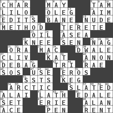 ACROSS 1. Burn to charcoal 5. Fifth month 8. Scottish cap 11. _ and Stitch 12. Cassini of fashion 14. Direct toward a target or goal 15. Proofreads 17. Object of repulsion 18. Naked 19. Mode 21. Cylindrical with tapered ends 23. Petroleum 25. Toward the sea 26. Leg joint 27. Elected rep. 28. Tired old horse 31. Mouth or opening 33. Apple computer (short form) 35. A sleeping potion; an opiate (poet.) 37. 154 in Roman numerals 38. Krazy ___ of comics 40. Soon (poet.) 41. Debunk (Brit. slang) 43. Three (prefix) 45. Actress Charlotte 46. Distress signal 47. Purpose 50. Greek god of love 52. Fast planes 53. Barrel 54. Northern region 56. Scheduled 61. Jai ____ 62. Thin strip of wood or metal 65. Peak District village in England 66. Put into a specified state 67. 4th largest of the Great Lakes 68. ____ Jay Lerner 69. Adept person 70. Fenced enclosure 71. Monthly bill DOWN 1. To starve (Brit.) 2. Flintstone garb 3. Set down 4. Writer of Portnoy's Complaint (1969) 5. Crowd into 6. Insect wing 7. Gossips 8. Pulled tight 9. Helper 10. Madame (abbr.) 13. Honkers 16. Within a short period 18. Teachers' org. 20. South Vietnam president (1954) 22. Tear apart 24. Path through which fluid escapes 26. Polynesian shrub of the pepper family 28. Nanny 29. Medicinal plant 30. Commissioned military rank (abbr.) 31. Margarine 32. Teases 34. Feline 36. Armed conflicts 37. Music discs 39. Long journey 42. Abrupt rush of wind 44. Angers 48. Vertical member of a panel or frame 49. Fortification 51. Stare 52. _-fi 54. Actor Baldwin 55. Pace 57. The sixth month of the Jewish calendar 58. Story 59. Liveliness 60. Scratch 61. White ___ sheet 63. Standoff 64. Layer