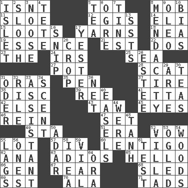 ACROSS 1. Is not 5. Small child 8. Crowd into 11. _ gin 12. The front part of a cuirass 14. Biblical high priest 15. Plunders 17. Tall tales 18. Teachers' org. 19. Center 21. Eastern Standard Time (abbr.) 22. Two (Sp.) 23. Definite Article 24. Big collection agency 25. Ocean 27. Cooking vessel 28. Jazz singing style 31. Mouths or openings 35. Animal enclosure 37. Become fatigued 38. Flat circle 39. To riddle 41. Singer James 42. Otherwise 43. The 23rd letter of the Hebrew alphabet 45. Sight organs 46. It's straight from the horse's mouth 47. Arrange properly for use 49. R.R. building 51. Period 52. Solemn pledge 55. Car dealer's back yard 57. HTML Container Element 60. Small, flat, pigmented spot on the skin 62. Santa ___, CA 63. Goodbye (Sp.) 65. Phone greeting 66. Commissioned mil. rank 67. Posterior 68. Downhill vehicle 69. Fast jet (abbr.) 70. Chicken ___ king 71. Bits DOWN 1. Small island 2. Make a splashing sound 3. Trap for birds or small mammals 4. False hair 5. Afternoon social gathering 6. Legendary monster 7. Metal containers 8. Ananias' fault 9. Butter sub 10. Prejudice 13. Fast planes 16. Sever or remove by pinching or nipping 17. Next before 20. Riding implement 26. First name in cosmetics 29. Johnson of "Laugh-In" 30. Afternoon social gatherings 31. Baltic tributary 32. Cause heat under the collar 33. Helper 34. Odor 36. Fish or hair follower 40. Artist's stands 44. We are 48. Hyperbolic tangent 50. The sixth month of the Jewish calendar 52. Country estate 53. Stared 54. Forest 55. Falls behind 56. Washington bills 58. The main thing one is thinking about 59. Small bottle 61. Trial 64. Mouth or opening