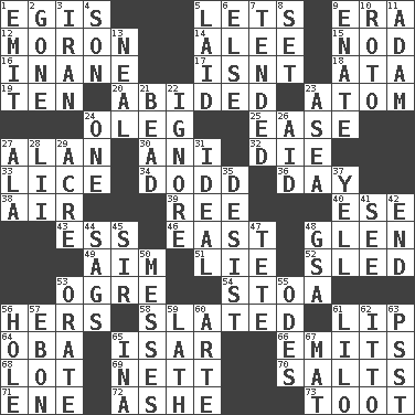 ACROSS 1. The front part of a cuirass 5. Allows 9. Epoch 12. Person of subnormal intelligence 14. Toward shelter 15. Dreamland 16. Lacking in sense or substance 17. Is not 18. "One Day ___ Time" 19. Nine, plus one 20. Stayed 23. Tiny particle 24. Cassini of fashion 25. Relaxation 27. Actor Alda or Thicke 30. Cuckoo 32. Pass on 33. Louse (plural) 34. Texas town _ City 36. 24 hours 38. Atmosphere 39. To separate or throw off 40. Compass dir. 43. Double-curved letter 46. 90 degrees 48. Small, secluded valley 49. Direct toward a target or goal 51. Whopper 52. Downhill vehicle 53. Legendary monster 54. Portico 56. Possessive pronoun 58. Scheduled 61. Mouth edge 64. Chief or king in Benin or Nigeria 65. Austrian river, tributary to the Danube 66. Gives off 68. Car dealer's back yard 69. Remaining after all deductions 70. Table seasonings 71. Compass dir. 72. American tennis player Robert 73. A blast of a horn DOWN 1. Send forth 2. Went 3. SW Asia republic 4. Male offspring 5. Put down 6. Otherwise 7. Watched over 8. Arrange properly for use 9. Related on the mother's side 10. Printing process, for short 11. First of billions? 13. Be tempered by heat 21. Necklace unit 22. Refuse to acknowledge 23. At sea 24. Single 26. Assist 27. Chicken ___ king 28. Cards in a Roman deck? 29. 1/640 square mile 31. Standard of perfection 35. Cease 37. Shout 41. Observe 42. Conclude 44. Droops 45. Title for a knight 47. Wig 48. Girls' org. (abbr.) 50. Makes clutter 53. Speak pompously 55. Lyric poems 56. Hollow 57. Inky black, to poets 59. Thin strip of wood or metal 60. Johnson of "Laugh-In" 61. _ and Stitch 62. "Tell ____ the Marines!" 63. Inconspicuous attention getter 65. _ tizzy (2 wds.) 67. Floor covering