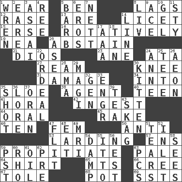 ACROSS 1. Put on (as clothing) 5. Benjamin's nick name 8. Falls behind 12. To erase 13. "We ___ not amused" (Victoria) 14. It is permitted: Lat. 15. Celtic language 16. Happening in regular succession 19. Teachers' org. 20. Choose not to consume 21. "Vaya con ____" 23. One (Scot) 24. _ moment's notice (2 wds.) 27. 480, 500 or 516 sheets of paper 30. Leg joint 31. Break 34. To the inside or interior of 35. _ gin 38. Rep 40. Adolescent 41. Israeli folk dance 42. Swallow 44. Relating to the mouth 45. Libertine 46. "___ Little Indians" 47. Opposite of masc. 50. Opposed to 53. Preparing or cooking with lard 57. Followers of ems 59. Appease 63. Light colored 64. Chest covering 65. Mountains (abbr.) 66. Algonquian 67. Lacquered or enameled metalware 68. Cooking vessel 69. Fast planes DOWN 1. Songbird 2. Having ears or earlike features 3. Slender Brazilian palm 4. To riddle 5. Sharp remark 6. Greek god of love 7. Remaining after all deductions 8. 54 in ancient Rome 9. Adept person 10. Set 11. Filthy place 14. Actor's bit 17. American Automobile Association (abbr.) 18. Metal container 20. Toward the sea 22. Severe or trying experience 24. Queen of England 1702-14 25. False hair 26. A really long time 28. Wet nurse (var.) 29. Wise men 30. Baby cat 32. Commissioned mil. rank 33. Engineer (abbr.) 35. Opportunity 36. Old wives' tales, e.g. 37. NW Algerian seaport 39. Beverage made from leaves 43. Heroin 47. Secret move to avoid paying debts 48. Erode 49. Medical imaging device (abbr.) 51. Rends 52. An arm off of a larger body of water 54. Moist 55. "Tell ____ the Marines!" 56. A home for chicks 58. Observes 59. Pacific Standard Time (abbr.) 60. 17th letter of the Greek alphabet 61. Petroleum 62. Before (prefix) 63. Personal Computers (abbr.)
