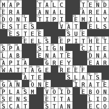 ACROSS 1. Atlas unit 4. Baby powder 8. Look after 12. Period 13. Of or related to the anus 14. Length times width 15. Do not 17. Native american tent (variation) 18. Poet Dickinson 19. _____ Park, CO 21. Large container 23. Raised railways 24. First name in cosmetics 26. Take to court 28. Snakelike fish 30. Curse 34. Health resort 37. Attach a signature 39. Quote 40. Experiment locale 41. Related on the mother's side 43. Heredity factor (abbr.) 44. Capital of Western Samoa 46. Jennifer or Joel 47. Ewer handle 48. Electrical Measurement 51. Coral ridge 54. Had dinner 55. Narrow boards 58. Separate the seeds from cotton 61. Single 63. Feeling or showing extreme anger 65. Suffix with ecto or cyto 67. Lacking any legal or binding force 71. Inky black, to poets 72. Elected reps. 73. Singer James 74. Flaplike covering 75. Scram! 76. Comedian Laurel of Laurel & Hardy 77. Environmental prefix DOWN 1. Ancient Persian 2. Came up 3. Leg coverings 4. Make lace 5. Cuckoo 6. Pet locale 7. 154 in Roman numerals 8. Scottish cap 9. One of the Great Lakes 10. 1994 drama film starring Jodie Foster 11. 24-hour periods 16. False hair 18. Needle holder 20. Perceive with the eye 22. Cleo's killer 25. Otherwise 27. And so on (abbr.) 29. Burn superficially 30. Keyboard key 31. Flintstone garb 32. Inactive volcano in Sicily 33. Pull into pieces 34. Cole _ (cabbage dish) 35. Dad 36. "This won't hurt ____!" 38. Slender fish 42. Sight organs 45. "One Day ___ Time" 49. Tiny particle 50. Commissioned mil. rank 52. Connecticut Ivy Leaguer 53. Conductor's collection 56. Eating place 57. Unemotional 58. Global Positioning Systems (abbr.) 59. Actor Baldwin 60. Grandmother 62. Nights before holidays 64. Inside; within (prefix) 66. Fast jet (abbr.) 68. Baseball player Mel 69. Call ___ day 70. One of the 12 tribes of Israel