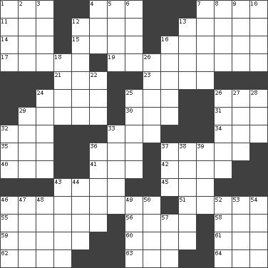 ACROSS 1. E Mali city 4. For each 7. Sinks 11. Black tropical American cuckoo 12. ____ d'Azur (French Riviera) 13. Chummy 14. Period of immesurable duration 15. "Beetle Bailey" pooch 16. Finds the solution 17. Member of a famous L.A. basketball team 19. Helper 21. Compass dir. 23. Angers 24. Toward shelter 25. Personal question 26. Compass dir. 29. Rhinal 30. Followers of ems 31. Teachers' org. 32. Or not 33. Big collection agency 34. Boat paddle 35. Bear (Spanish) 36. _-fi 37. Bake eggs in their shells 40. Lair 41. Area sheltered from the wind 42. Trial 43. Examine minutely or intensely 45. 100% 46. Decision 51. Mexican monetary units 55. Foolish or stupid persons 56. Be footloose 58. D.D.E's nickname 59. Impressive in appearance 60. The sixth month of the Jewish calendar 61. "We ___ not amused" (Victoria) 62. Celtic language 63. Allow 64. Atlas unit DOWN 1. Highlander 2. Small Philippine buffalo 3. Pig sound 4. Cooking vessel 5. Singer James 6. Vintage cars 7. Table seasonings 8. Inventor's middle name 9. Small, secluded valley 10. System (abbr.) 12. Pupil covering 13. Airs 16. Titles for men of rank and authority 18. Snakelike fish 20. Public displays of written messages 22. Snakelike fish 24. Composer Copland 25. Nest on high 26. Derisive sound 27. Singe 28. Armed conflict 29. Characteristic smell of wine 32. Allow head to fall sleepily 33. Ancient Celtic tribe of eastern Britain 36. Narrow boards 37. R.R. building 38. Assistant 39. Capri or Wight 43. Fur scarf 44. Quote 46. Trig term 47. Aroma 48. Teases 49. Of the mouth 50. Thickened enlargement 52. Thailand, formerly 53. Gumbo ingredient 54. Ooze 57. Large container
