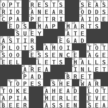 ACROSS 1. Choose 4. Musical pauses 9. Oceans 13. _ de Janeiro 14. Approach 15. Likelihood 16. Accounting whiz (abbr.) 17. _ dish (used to culture cells) 18. Helper 19. Begley and Asner 21. Atlas unit 22. Shops 24. Chop _ 26. Had dinner 27. Being in motion 29. Mild oath 30. Secret plans 31. Mine, in Marseilles 33. Small child 36. "Barney Miller" actor Jack 37. Gist 40. Ripen 41. Snakelike fish 42. Allows 43. Promenades 45. Length times width 47. An arm off of a larger body of water 48. Groovy apt. 49. Cy Young winner Saberhagen 50. Drinks excessively 52. A female animal or person 54. Armed conflict 56. Casino tip 57. Toward the future 59. Car dealer's back yard 61. Capital of Western Samoa 62. Haggard of country music 63. Night before a holiday 64. Fermented drink made from hops 65. NE Netherlands city 66. Ocean DOWN 1. The grampus (Milton) 2. Corncob 3. Inedible or poisonous agaric 4. Strike 5. Foe 6. Bristle 7. Canvas cover 8. _ Lanka 9. Flew 10. Prepare for publication 11. Sums up 12. Compass dir. 20. Set of matching outer garments 22. Mysterious quality of enchantment 23. "One Day ___ Time" 25. Celtic language 27. Domed church section 28. A type of plum 29. Immeasurably long periods of time 31. Toward the sea 32. Was introduced to 33. Baron Munchausen's specialties 34. Stare 35. Trial 38. Bobsleighs 39. Independent ruler or chieftain 44. Afresh 45. Become visible 46. Actress Charlotte 49. Calif. Air Force Base 50. Drink excessively 51. Migrant worker of the '30s 52. "______ My Girl" (Turtles hit) 53. Possessive pronoun 55. Be footloose 56. Bar bill 57. Housemaid (var.) 58. Lair 60. Afternoon social gathering