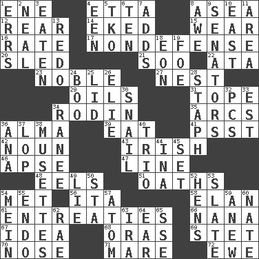ACROSS 1. Compass dir. 4. Singer James 8. At sea 12. Bring up, as a child 14. Made supply last 15. Erode 16. Pace 17. Unrelated to defense, as in spending 20. Downhill vehicle 21. "Barney Miller" actor Jack 22. _ moment's notice (2 wds.) 23. Impressive in appearance 27. Egg locale 29. Petroleums 31. Drink excessively 34. "The Thinker" sculptor 35. Arches 36. _ mater 39. Consume 41. Inconspicuous attention getter 42. Part of speech 43. From or relating to Ireland 46. Domed church section 47. Actor's bit 48. Snakelike fish 51. Profane or obscene expressions 54. Was introduced to 56. Call ___ day 58. Style 61. Pleas 66. Grandmother 67. The main thing one is thinking about 68. Mouths or openings 69. Proofreading order 70. Characteristic smell of wine 71. Female horse 72. She-sheep DOWN 1. Blunders 2. Anneal 3. Eroded 4. Car or cant ending 5. Ring climax 6. Nine, plus one 7. Does sums 8. Deep reverence 9. Legislators 10. 90 degrees 11. Type of rug 13. Redecorate 18. Period of immesurable duration 19. Enemy 24. Oct. 31 cry 25. Hat (slang) 26. Writer Wiesel 28. Staphylococcus 30. Slow-paced one 32. Personal Computers (abbr.) 33. Eastern Standard Time (abbr.) 34. Indian princess (variant) 36. Santa ___, CA 37. Chop off 38. French bagpipes 40. Musical group of three 44. _ tizzy (2 wds.) 45. Put into a specified state 49. Untruth 50. R.R. building 52. Coop moms 53. Chalkboard 54. Chow _ 55. Inside; within (prefix) 57. Tiny particle 59. Afresh 60. Nathan's nickname 62. Actress Charlotte 63. Retirement account (abbr.) 64. Ewer handle 65. Compass dir.