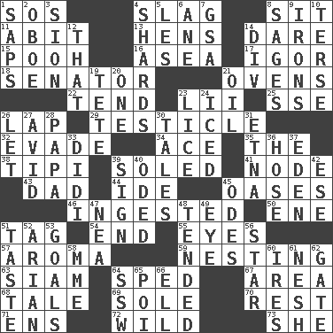 ACROSS 1. Mayday 4. Volcanic refuse 8. Be seated 11. "This won't hurt ____!" 13. Coop moms 14. Have the gumption 15. "Silly old bear" 16. Toward the sea 17. Composer Stravinsky 18. Legislator 21. Baking chambers 22. Look after 23. Cards in a Roman deck? 25. Compass dir. 26. Pet locale 29. A testis 32. Dodge 34. Adept person 35. Definite Article 38. Native american tent (variation) 39. Having a sole or soles 41. Thickened enlargement 43. June honoree 44. Binary compound 45. Fertile tracts in a desert 46. Eaten 50. Compass dir. 51. Label 54. Conclude 55. Sight organs 57. Scent 59. Inhabiting a nest 63. Thailand, formerly 64. Hurried 67. Type of rug 68. Lie 69. Flatfish 70. Repose 71. Followers of ems 72. Rampant 73. A female animal or person DOWN 1. Plant excrements 2. Mitch Miller's instrument 3. The Jewish people; Israel 4. Pottery fragments 5. French article 6. One (Scot) 7. Girls' org. (abbr.) 8. Gurus 9. Metal shackles 10. Laconic 12. Not this but _ 14. HTML Container Element 19. False hair 20. Single 21. Petroleum 23. Louse (plural) 24. On the rocks 26. Allow 27. Enthusiastic 28. Dad 30. Stories 31. Inactive volcano in Sicily 33. "You Light Up My Life" star Conn 36. Flexible conduit 37. Genesis locale 39. Signal 40. Wrote a lyric poem 42. Compass dir. 45. Lyric poems 47. Teachers' org. 48. Looked after 49. Sight organ 51. Clothes sense 52. Believer in; advocate of (suffix) 53. Purposes of endeavors 56. Play the lead 58. Madame (abbr.) 60. Angers 61. Tender 62. Yard entry 64. Compass dir. 65. Luau course 66. Pipe bend