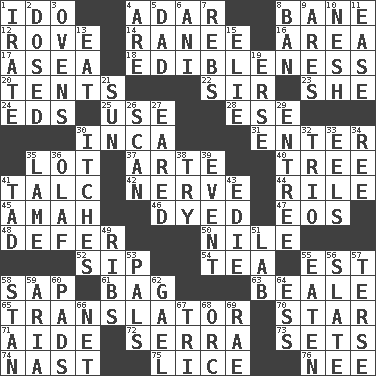 ACROSS 1. Wedding promise 4. The sixth month of the Jewish calendar 8. Object of repulsion 12. Be footloose 14. Indian princess (variant) 16. Length times width 17. Toward the sea 18. The property of being fit to eat 20. Portable shelters 22. Title for a knight 23. A female animal or person 24. Begley and Asner 25. Purpose 28. Compass dir. 30. South American Indian 31. Keyboard key 35. Car dealer's back yard 37. Johnson of "Laugh-In" 40. Woody plant 41. Baby powder 42. Boldness 44. Cause heat under the collar 45. Wet nurse 46. Colored 47. Greek goddess of the dawn 48. Put off 50. "Death on the ____" 52. Small drink 54. Beverage made from leaves 55. Eastern Standard Time (abbr.) 58. Plant excrement 61. Container for groceries 63. Calif. Air Force Base 65. Interpreter 70. Play the lead 71. Helper 72. Father Junipero _ 73. Arranges properly for use 74. Political cartoonist Thomas 75. Louse (plural) 76. Born DOWN 1. Feeling or showing extreme anger 2. Administered medicine 3. Baking chambers 4. "We ___ not amused" (Victoria) 5. Male parent 6. Cuckoo 7. Confederate soldiers (slang) 8. Prohibit 9. Ancient Greek god of war 10. Soft 11. Comfort 13. Consume 15. Writer Wiesel 19. Celtic language 21. Player for Phoenix 26. Glance over 27. Having ears or earlike features 29. Main course 30. Irritating cutaneous sensations 32. Musical group of three 33. Snakelike fish 34. To sift 35. Unable to walk 36. Norwegian king 38. Attempt to accomplish something 39. Incident 41. Bit 43. Singer Brickell 49. Chest bones 51. Experiment locale 53. Friends 55. Ingested 56. Chalkboard 57. Laconic 58. Comedian Laurel of Laurel & Hardy 59. Roberta Peters solo 60. Writing tablets 62. Highlander 64. Curvy letter 66. Fish or hair follower 67. Three (prefix) 68. The grampus (Milton) 69. Actress Charlotte