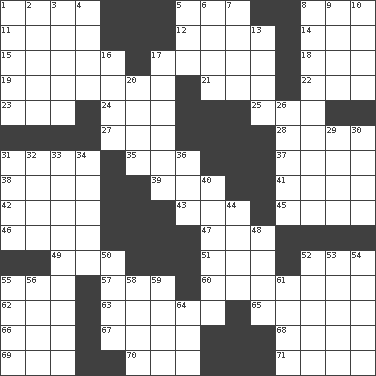 ACROSS 1. Penny 5. Health resort 8. Make lace 11. Length times width 12. Table seasoning 14. Insect wing 15. Typical standards 17. Phone greeting 18. Directed 19. Contrary to your interests or welfare 21. Ewer handle 22. French article 23. Area sheltered from the wind 24. _ tizzy (2 wds.) 25. Feline 27. Title for a knight 28. Backtalk 31. Fastener 35. Parent Teacher Association (abbr.) 37. A type of plum 38. Expression of disdain 39. What Jean-Claude Killy likes to do 41. A really long time 42. In addition 43. One (Scot) 45. Is not 46. It's straight from the horse's mouth 47. Slender fish 49. Ocean 51. Compass dir. 52. R.R. building 55. Small island 57. Adept person 60. Legislator 62. Retirement account (abbr.) 63. Tinged 65. Resident of Iraq 66. Lair 67. Downhill vehicle 68. A slight indication 69. Eastern Standard Time (abbr.) 70. Double-curved letter 71. The bottom of a shoe or boot DOWN 1. Lessep's creation 2. Eat (away) 3. Boldness 4. Docile 5. Compass dir. 6. Light colored 7. Silent film actress Nazimova 8. Baron Munchausen's specialties 9. Toward shelter 10. Small boys 13. Torque (variant) 16. Indian titles of respect 17. Centers 20. Sever or remove by pinching or nipping 26. Slender Brazilian palm 29. Within a short period 30. Emitted 31. Coast Guard woman 32. The longest river in the world 33. Aide 34. Give a jingle 36. Alias (abbr.) 40. Consume 44. Comfort 48. Painter Guido (1575-1642) 50. Tenement units (abbr.) 52. Lacking originality or spontaneity 53. Woman's close-fitting hat 54. Satellite of Uranus 55. Helper 56. Angers 58. Cause heat under the collar 59. Washington bills 61. Bowlike part 64. Music discs