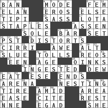ACROSS 1. Bar 4. Method 8. Opposite of masc. 11. Liveliness 13. Greek god of love 14. Otherwise 15. Native american tent (variation) 16. Backtalk 17. Globular water bottle used in Asia 18. Paper fasteners 21. NE Netherlands city 22. Not divided or shared with others 23. Long, evenly shaped piece 25. Put into a specified state 26. Pacific Standard Time (abbr.) 29. What propaganda does 32. High-altitude cloud 34. Deep reverence 35. The first octave above the treble staff 38. Change direction abruptly 39. For Whom the Bell _____ 41. Vintage cars 43. Car or cant ending 44. Personal question 45. Pig sounds 46. Eaten 50. Morning condensation 51. Erode 54. Compass dir. 55. Extremities 57. Sports stadium 59. Snuggling 63. Hoop that covers a wheel 64. Among 67. Length times width 68. Comfort 69. Quote 70. Take ten 71. Compass dir. 72. Mild oath 73. A female animal or person DOWN 1. Wagers 2. Set down 3. California wine valley 4. Makes clutter 5. Mouth or opening 6. Two (Sp.) 7. Curvy letter 8. Soft thread for cleaning between teeth 9. First name in cosmetics 10. Intended 12. Pinches, bites 14. Raised railways 19. Farming town in central California 20. Connecticut Ivy Leaguer 21. Nonscientific branch of learning 23. Soup holder 24. Ancient Greek god of war 26. Personal Computers (abbr.) 27. Filth; sediment 28. Loyal 30. Lies 31. Indian skirt 33. Painter Guido (1575-1642) 36. Grant temporary use of 37. Casino tip 39. Labels 40. Double curve, resembling the letter S 42. Compass dir. 45. Likelihood 47. Teachers' org. 48. Watched over 49. Compass dir. 51. Eroded 52. Believer in; advocate of (suffix) 53. Laconic 56. Play the lead 58. Born 60. Angers 61. Soft 62. Yard entry 64. Adept person 65. Russian fighter aircraft 66. Call ___ day