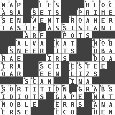 ACROSS 1. Atlas unit 4. French article 7. Coalition 11. White ___ sheet 12. Arranges properly for use 13. A-one 14. Elected rep. 15. Left 16. Wanderer 17. Clothes sense 19. Helper 21. Sandy's bark 23. Plant holders 24. Inventor's middle name 25. Krazy ___ of comics 26. Disorderly crowd 29. Scornful expression 30. ___ a Wonderful Life 31. Chief or king in Benin or Nigeria 32. Actress Charlotte 33. Big collection agency 34. ___ good deed 35. Lyricist Gershwin 36. _-fi 37. First name in cosmetics 40. Boat paddle 41. Car or cant ending 42. Belonging to Elizabeth 43. Examine hastily 45. _ tizzy (2 wds.) 46. Making a chance decision by using lots 51. Takes hold of 55. Foolish or stupid persons 56. Stare wonderingly 58. Floor protector 59. Having high moral qualities 60. Blunders 61. Santa ___, CA 62. Celtic language 63. Environmental prefix 64. Layer DOWN 1. Vertical spar for supporting sails 2. Toward the sea 3. Zero-star reviews 4. Area sheltered from the wind 5. Inactive volcano in Sicily 6. Fast planes 7. Naughty children 8. Pale green bean 9. Presage 10. Sure thing 12. Turn aside suddenly 13. Mail 16. Disturbances 18. Falsehood 20. Arguments over trivial matters 22. Distant 24. Approach 25. Japanese brewing company 26. Methods 27. Mitch Miller's instrument 28. Sound made by sheep 29. "Two Mules for Sister ____" 32. _ de Janeiro 33. Ancient Celtic tribe of eastern Britain 36. Theater features 37. Biblical high priest 38. Scorches 39. Czar 43. Took without asking 44. Quote 46. Trig term 47. Scent 48. Chest bones 49. Double curve, resembling the letter S 50. Drug cop 52. Wet nurse 53. Object of repulsion 54. Comedian Laurel of Laurel & Hardy 57. Adept person