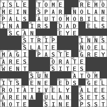 ACROSS 1. Capri or Wight 5. Heavy book 9. San ____ (Riviera town) 13. Count _ (2 wds.) 14. Coast Guard woman 15. Pitcher Ryan 16. Friends 17. Car 19. _ tizzy (2 wds.) 20. Big collection agency 21. Male parent 22. Raised railways 23. Skim 25. Sight organ 26. Long narrow piece of something 30. Restaurants 34. Schedule 35. Christmas carol 36. Wise men 39. Thick mixture 42. Jennifer or Joel 43. Ancient Greek god of war 44. Speak pompously 46. Left 47. Settings 48. Player for Phoenix 51. Smallest unit of an element 54. It is 57. Compass dir. 58. Begley and Asner 60. Set 62. Rotating or pertaining to rotation 65. Toward shelter 66. Sports stadium 67. ____ Bator 68. Puts into a specified state 69. Short letter 70. Trig term 71. Inconspicuous attention getter DOWN 1. Body of Kaffir warriors 2. Actors Connery and Penn 3. Pale purple color 4. Followers of ems 5. Russian ruler of old 6. Musical composition 7. Floor protector 8. Eat (away) 9. Director Reiner 10. Writer Wiesel 11. Promenade 12. Singles 15. Thickened enlargement 18. Fifth month 20. International (abbr.) 24. Help 27. Hit sharply and swiftly 28. Call ___ day 29. Mexican monetary units 30. Consume 31. And not 32. Born 33. Stealthy 36. Informal term for the mouth 37. "We ___ not amused" (Victoria) 38. Commissioned mil. rank 40. Three (prefix) 41. Erode 45. Beverages made from leaves 48. Stalk of a moss capsule 49. University (slang) 50. Congenital growth or mark on the skin 52. Stares 53. Confronts 54. SW Asia republic 55. "Corrida" creature 56. Proofreading order 58. Style 59. Unit of force 61. For fear that 63. A saturated hydrocarbon 64. Biblical high priest 65. Viper