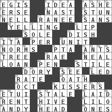 ACROSS 1. Armor plate that protects the chest 5. The content of cognition 9. American tennis player Robert 13. Celtic language 14. Political cartoonist Thomas 15. Make senseless or dizzy 16. 1994 drama film starring Jodie Foster 17. Indian princess (variant) 18. Without 19. Crying or shouting loudly 21. Mouth edge 22. Flatfish 23. Food container 24. Call ___ day 27. For each 28. A single undivided whole 29. Typical standards 31. Parent Teacher Assoc. 32. Pismires 36. Woody plant 37. Actress Charlotte 38. Be tempered by heat 39. Grant temporary use of 40. Fenced enclosure 41. Vertical member of a panel or frame 42. Dinghy 44. Perceive with the eye 46. Directed 47. Assign a rank or rating to 48. Pledge 50. Sep. follower 51. Smoochers 54. Needle holder 56. Showing deterioration from age 58. Put down 60. Monthly bill 61. Hub of activity 62. _ and Stitch 63. "60 Minutes" Commentator Rooney 64. Froth on beer 65. Singles DOWN 1. Car or cant ending 2. Jennifer or Joel 3. Small island 4. Makes a sale 5. Sillier 6. Mild oath, euphamism for damn 7. Compass dir. 8. Had dinner 9. Helper 10. Staphylococcus 11. Attila the _ 12. Followers of ems 17. Cause heat under the collar 20. Chops off 21. Cards in a Roman deck? 23. Heredity factor (abbr.) 24. International (abbr.) 25. "Corrida" creature 26. Length times width 28. Shoshoni 30. Ananias' fault 31. Baking dish 33. Famous astronaut Armstrong 34. Lie 35. Downhill vehicle 37. Marina Del _, California 40. Before (prefix) 41. Arranges properly for use 43. Baseball player Mel 44. Dirtied 45. Relaxation 47. One shot 49. Phone greeting 51. Polynesian shrub of the pepper family 52. Water falling in drops from the sky 53. Drop; flow; fall 54. Epoch 55. "___ Little Indians" 56. Quiet! 57. Make a knot 59. Two (Sp.)