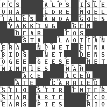 ACROSS 1. Personal Computers (abbr.) 4. High mountains 8. Capri or Wight 12. Mouth or opening 13. Old wives' tales, e.g. 14. Christmas carol 15. Lies 18. Small Philippine buffalo 19. Leaves 20. Chattering 22. Commissioned military rank (abbr.) 23. Letter starter 24. Greek goddess of the dawn 25. R.R. building 26. Of or relating to Laos or its people 30. Epoch 33. Music written for nine 36. Inactive volcano in Sicily 37. Auction offers 39. Fish or hair follower 40. Habitations of wild animals 41. Double curve, resembling the letter S 42. Honkers 44. Was introduced to 45. Fools 47. Spoil 50. Adept person 51. On the rocks 53. Had dinner 54. Borne 57. Grain storage tower 59. Commotion 61. Keyboard key 63. Play the lead 64. Johnson of "Laugh-In" 65. Environmental prefix 66. Hearing organs 67. Sliced desserts 68. River (Sp.) DOWN 1. Cooking vessel 2. Supercomputer manufacturer 3. First course 4. Actor Alda or Thicke 5. Yearn 6. Adept person 7. Ocean 8. Eaten 9. Within a short period 10. Area sheltered from the wind 11. Raised railways 16. Supplements with great effort 17. Three-handed card game 21. SW Asia republic 22. Thick or sticky substance 24. Ingest 26. Allows 27. A whole individual unit 28. Singer Murray 29. Political cartoonist Thomas 30. Inky black, to poets 31. Swiss mountan, "Queen of the Mountains" 32. An important port of Yemen 34. Washington bills 35. Born 38. Elected representatives 42. Turn to the right 43. Arab leader 46. Frozen water 48. Measure of real estate 49. It's straight from the horse's mouth 52. Prevent from occurring 53. Having or resembling wings 54. Quote 55. Ancient Greek god of war 56. Tenth: prefix 57. Compass dir. 58. Call ___ day 59. Plant excrement 60. Three (prefix) 62. Friend of Pooh