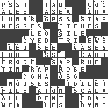 ACROSS 1. Inconspicuous attention getter 5. Small boy 8. Gear tooth 11. Toward shelter 12. At sea 14. Retirement account (abbr.) 15. Type of eclipse 17. Global Positioning Systems (abbr.) 18. Play the lead 19. Makes clutter 21. Skin irritations 23. Lion 25. Filth; sediment 26. Colored 27. Three (prefix) 28. She-sheep 31. Flowery wreath 33. Perceive with the eye 35. Flower holders 37. Ear part 38. Fast jet (abbr.) 40. Draw slowly or heavily 41. Wear away 43. Plant excrement 45. Regret 46. Shallow baking pan 47. Strike 50. Loose flowing garment 52. Capital of the state of Qatar 53. Bear (Spanish) 54. Annoying sounds 56. Rest room 61. Do some clerical work 62. Tiny particle 65. Any of the three canals of the cochlea 66. 100% 67. Gouge 68. Dutch treat 69. Teachers' org. 70. French article 71. Centimeter-gram-second unit of force DOWN 1. Inside of hand 2. Change direction abruptly 3. Elected reps. 4. Beverages made from leaves 5. Label 6. Viper 7. Stop 8. Quote 9. Mouths or openings 10. Slender fish 13. Moving or stirring 16. Trust 18. A female animal or person 20. Observes 22. 154 in Roman numerals 24. Lyric poems 26. Passed on 28. Son of Isaac 29. We are 30. Eastern Standard Time (abbr.) 31. Australian parrot (variant) 32. Inky black, to poets 34. Double-curved letter 36. 1/640 square mile 37. Allow 39. Pacific island yam 42. Greek god of love 44. Mail 48. At or in the front 49. Soft color 51. Expressions of contempt or scorn 52. Expire 54. Mediterranean tributary 55. Rounded earthenware pot or jar 57. On the rocks 58. Kenny Rogers chart-topper in '80 59. Flair 60. Docile 61. Air blower 63. Single 64. Mountains (abbr.)