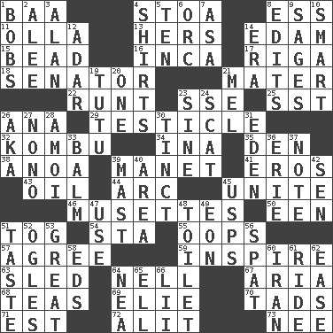 ACROSS 1. Sound made by sheep 4. Portico 8. Double-curved letter 11. Rounded earthenware pot or jar 13. Possessive pronoun 14. Dutch treat 15. Necklace unit 16. South American Indian 17. Port city in Latvia 18. Legislator 21. Mother 22. The smallest animal of a litter 23. Compass dir. 25. Fast jet (abbr.) 26. Santa ___, CA 29. A testis 32. Dried seaweed eaten as food 34. _ tizzy (2 wds.) 35. Lair 38. Small Philippine buffalo 39. French painter Edouard 41. Greek god of love 43. Lubricate 44. Curve 45. Join together 46. French bagpipes 50. Car or cant ending 51. Coat; cloak 54. R.R. building 55. I made a mistake 57. Match 59. Motivate 63. Downhill vehicle 64. 1994 drama film starring Jodie Foster 67. Operatic vocal solo 68. Afternoon social gatherings 69. Writer Wiesel 70. Bits 71. Eastern Standard Time (abbr.) 72. Came down and settled, as after flight 73. Born DOWN 1. Moves up and down 2. Toward shelter 3. Actor Alda or Thicke 4. Chest coverings 5. "___ Little Indians" 6. The grampus (Milton) 7. White ___ sheet 8. Proofreads 9. Gurus 10. Don Adams' spy role 12. The sixth month of the Jewish calendar 14. Period 19. Ballerina skirt 20. Single 21. Cartoonist voice _ Blanc 23. Trig term 24. Go away! 26. Alias (abbr.) 27. Words to Nanette 28. Mine, in Marseilles 30. Tinged 31. Locale of original sin 33. Lip ointment 36. 4th largest of the Great Lakes 37. Musical sound 39. Vertical spar for supporting sails 40. Length times width 42. Elected rep. 45. United States Postal Service (abbr.) 47. Purpose 48. Bathroom plumbing fixture 49. Period of immesurable duration 51. Clothes sense 52. Stares 53. Relatively large 56. Argument over a trivial matter 58. Begley and Asner 60. SW Asia republic 61. Travel on an animal 62. Relaxation 64. Teachers' org. 65. Pipe bend 66. Cards in a Roman deck?