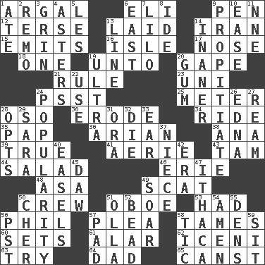 ACROSS 1. Therefore, facetiously 6. Connecticut Ivy Leaguer 9. Writing instrument 12. Laconic 13. Put down 14. SW Asia republic 15. Sends forth 16. Small island 17. Olfactory organ 18. Single 19. To (old English) 20. Yawn 21. General guideline 23. Single; one (prefix) 24. Inconspicuous attention getter 25. Distance measurement 28. Bear (Spanish) 30. Eat (away) 34. Travel on or in a vehicle 35. Infant food 36. Believer in; advocate of (suffix) 38. Santa ___, CA 39. Loyal 41. Nest on high 43. Scottish cap 44. Vegetable dish 46. One of the Great Lakes 48. White ___ sheet 49. Scram, to a cat 50. Ship's personnel 51. Mitch Miller's instrument 53. Possessed 56. Silvers or Donahue 57. Entreaty 58. Makes less strong or intense 60. Arranges properly for use 61. Having or resembling wings 62. Ancient Celtic tribe of eastern Britain 63. Attempt to accomplish something 64. Male parent 65. 2nd pers. sing. pres. of can (arch.) DOWN 1. Had dinner 2. San ____ (Riviera town) 3. Smile widely 4. Michaelmas daisies 5. French article 6. Compass direction 7. _ and Stitch 8. Binary compound 9. Conciliate 10. Relaxation 11. Compass dir. 13. Actor's bit 14. More lacking in sense or substance 19. Extremist 20. Chewing product 22. Purpose 24. Teen's desire 26. Pulitzer Prize-winning author Ferber 27. 480, 500 or 516 sheets of paper 28. Chooses 29. "Two Mules for Sister ____" 31. Mouth or opening 32. Expire 33. Hearing organ 37. Sibling's daughter 40. Artist's stands 42. Period 45. Simpleton 47. New York city 49. Fly high 50. "Mermaids" star 51. Spanish pot 52. Necklace unit 54. So be it 55. Cub Scout units 56. Pacific Standard Time (abbr.) 57. Groovy apt. 58. Nervous spasm 59. Be seated