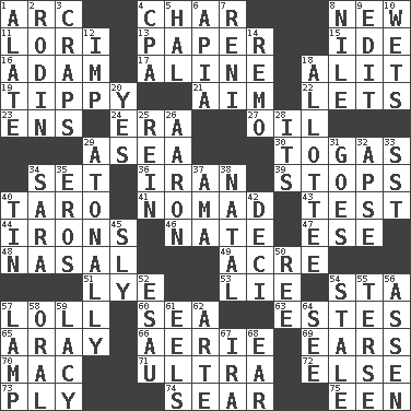 ACROSS 1. Curve 4. Burn to charcoal 8. ___ Haven, CT 11. Australian parrot (variant) 13. Some stationery 15. Binary compound 16. First of billions? 17. Place in a line 18. Came down and settled, as after flight 19. Likely to tip or tilt 21. Direct toward a target or goal 22. Allows 23. Followers of ems 24. Epoch 27. Lubricate 29. At sea 30. Ancient Roman robes 34. Arrange properly for use 36. SW Asia republic 39. Discontinues 40. Pacific island yam 41. Wanderer 43. Trial 44. Removes the wrinkles 46. Nathan's nickname 47. Compass dir. 48. Rhinal 49. 1/640 square mile 51. Potassium hydroxide 53. Untruth 54. R.R. building 57. Hang loosely or laxly 60. Ocean 63. _____ Park, CO 65. Like ___ of sunshine 66. Nest on high 69. Hearing organs 70. Apple computer (short form) 71. Extreme 72. Otherwise 73. Travel a route regularly 74. Shrivel 75. Car or cant ending DOWN 1. Having winglike extensions 2. "The Thinker" sculptor 3. Dice game 4. Numbers guy (abbr.) 5. Actor Linden 6. Capital of Western Samoa 7. Painter Guido (1575-1642) 8. The longest river in the world 9. Prepare for publication 10. Soaks 12. Naughty child 14. San ____ (Riviera town) 18. One to whom something is allotted 20. Affirmative reply 25. It's straight from the horse's mouth 26. Composer Copland 28. ___ a Wonderful Life 29. Lacking a tonal center or key 31. Travels 32. Domed church section 33. Fast jet (abbr.) 34. "Two Mules for Sister ____" 35. Greek god of love 37. Nursemaid (var.) 38. Relating to or accompanying birth 40. Metal container 42. Tenth: prefix 45. Cunning 50. Portuguese money of account (variant) 52. He sold his birthright 54. Showing deterioration from age 55. Laconic 56. NE Netherlands city 57. Desk light 58. Spoken 59. Made of lace 61. Snakelike fish 62. Johnson of "Laugh-In" 64. Perceive with the eye 67. Retirement account (abbr.) 68. Ewer handle