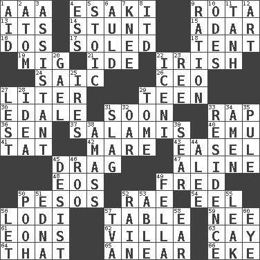 ACROSS 1. Auto club (abbr.) 4. 1973 Nobel Price Winner (Physics) Leo 9. Roll call or roster of names 13. It is 14. Check the growth or development of 15. The sixth month of the Jewish calendar 16. Two (Sp.) 17. Having a sole or soles 18. Portable shelter 19. Russian fighter aircraft 21. Binary compound 22. From or relating to Ireland 24. Ketch in the Levant 26. Corporate head (abbr.) 27. 61 cubic inches 29. Adolescent 30. Peak District village in England 31. Within a short period 33. Reproach for some lapse or misdeed 36. Elected rep. 37. Deli grouping 40. Australian flightless bird 41. Make lace 42. Female horse 43. Artist's stand 45. To trail on the ground 47. Place in a line 48. Greek goddess of the dawn 49. Flintstone 50. Mexican monetary units 52. Actress Charlotte 54. Snakelike fish 56. Farming town in central California 57. Eating place 59. Born 61. Immeasurably long periods of time 62. Country estate 63. Island 64. Not this but _ 65. Approach 66. Supplement with great effort DOWN 1. Help 2. Smallest unit of an element 3. Helper 4. Curvy letter 5. Unemotional 6. Old (Scot.) 7. Leg joint 8. It would 9. Food allowance for one day 10. Lyric poems 11. Hyperbolic tangent 12. Nonscientific branch of learning 20. Highlander 22. Ancient Celtic tribe of eastern Britain 23. Portuguese money of account (variant) 25. Angers 27. For fear that 28. The content of cognition 29. Heavy book 31. Volcanic refuse 32. Boat paddle 33. Home 34. So be it 35. Whine 38. Collect or gather 39. Shrivel 44. Toward shelter 45. Cease 46. Friend of Pooh 49. Chap (slang) 50. "Silly old bear" 51. Pulitzer Prize-winning author Ferber 52. Precipitation 53. Competent 55. Path through which fluid escapes 56. Allow 57. Federal power corp. 58. Ewer handle 60. Sight organ