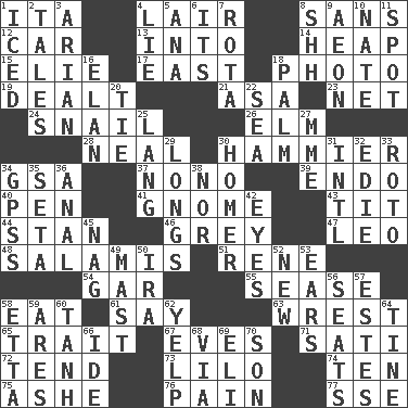 ACROSS 1. Call ___ day 4. Den 8. Without 12. Automobile 13. To the inside or interior of 14. Pile 15. Writer Wiesel 17. Compass direction 18. Picture 19. Started a card game 21. White ___ sheet 23. Fish or hair follower 24. Slow-paced one 26. Shade tree 28. Be tempered by heat 30. More given to overacting 34. Girls' org. (abbr.) 37. Words to Nanette 39. Inside; within (prefix) 40. Writing instrument 41. Dwarf 43. Teat (slang) 44. Comedian Laurel of Laurel & Hardy 46. Jennifer or Joel 47. Lion 48. Deli grouping 51. French philosopher Descartes 54. Slender fish 55. Gospel singer Marvin 58. Ingest 61. Declare 63. Take or capture by force 65. Distinguishing feature 67. Nights before holidays 71. Suttee (variant) 72. Be inclined (to) 73. _ and Stitch 74. Nine, plus one 75. American tennis player Robert 76. Ache 77. Compass dir. DOWN 1. On the rocks 2. Stories 3. Believer in; advocate of (suffix) 4. Untruth 5. Santa ___, CA 6. It is 7. Round or rotation of duties 8. Quiet! 9. Period of immesurable duration 10. Nathan's nickname 11. Blemish 16. Enthusiasm 18. Inside of hand 20. Neckwear 22. Ocean 25. Austrian-born American filmmaker Fritz 27. Madame (abbr.) 29. Yearns 30. Home run 31. International (abbr.) 32. Singer Brickell 33. Printing process, for short 34. Global Positioning Systems (abbr.) 35. Stalk of a moss capsule 36. Of or related to the anus 38. And not 42. Sight organs 45. Tired old horse 49. Vertical spar for supporting sails 50. Retirement account (abbr.) 52. ___ Haven, CT 53. Hearing organs 56. Theater features 57. _____ Park, CO 58. Singer James 59. Ancient Greek god of war 60. Hyperbolic tangent 62. Sharp bark 64. Prong on a fork 66. Binary compound 68. By way of 69. Biblical high priest 70. Manchild