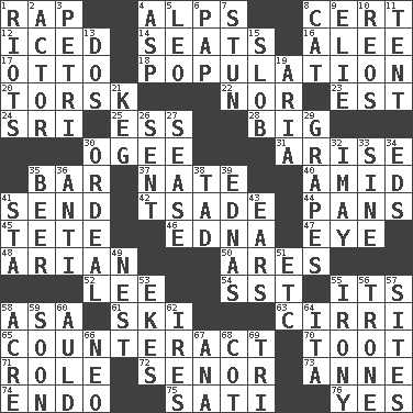ACROSS 1. Strike 4. High mountains 8. Sure thing 12. On the rocks 14. Theater features 16. Toward shelter 17. "Beetle Bailey" pooch 18. Census information 20. Cod relative 22. And not 23. Eastern Standard Time (abbr.) 24. Indian title of respect (Mr.) 25. Curvy letter 28. Large 30. Double curve, resembling the letter S 31. Ascend 35. Drinking establishment 37. Nathan's nickname 40. Among 41. Transmit 42. Sadhe (variant) 44. Zero-star reviews 45. Wig 46. Pulitzer Prize-winning author Ferber 47. Sight organ 48. Believer in; advocate of (suffix) 50. Ancient Greek god of war 52. Area sheltered from the wind 54. Fast jet (abbr.) 55. It is 58. White ___ sheet 61. What Jean-Claude Killy likes to do 63. High-altitude cloud 65. Frustrate 70. A blast of a horn 71. Hero or heavy, e.g. 72. Sir (Sp.) 73. Singer Murray 74. Inside; within (prefix) 75. Suttee (variant) 76. Affirmative reply DOWN 1. Disturbances 2. Thespian 3. _ dish (used to culture cells) 4. Cleo's killer 5. Lion 6. Infant food 7. Surprise greatly 8. Feline 9. Writer Wiesel 10. Vintage cars 11. Portable shelter 13. Two (Sp.) 15. Oscar Madison type 19. Roberta Peters solo 21. Cask 26. Emitted 27. Gospel singer Marvin 29. Wine fruits 30. Severe or trying experience 32. "If ____ say so..." 33. Trig term 34. Begley and Asner 35. Fermented drink made from hops 36. Opposed to 38. Small amount or degree 39. Ferber et al. 41. R.R. building 43. Hearing organs 49. Egg locale 51. And so on (abbr.) 53. Makes supply last 55. Literary sarcasm 56. Heavy duty weighing machine 57. Locates 58. Land measure 59. Within a short period 60. Old (Scot.) 62. Angers 64. Call ___ day 66. Modern: prefix 67. Santa ___, CA 68. Small bed 69. Three (prefix)