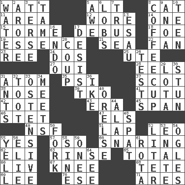 ACROSS 1. Electrical Unit 5. Keyboard modifier key 8. Feline 11. Type of rug 12. Had on 14. Single 15. Singer Mel 17. Alight from a bus 18. Enemy 19. Substance 21. Ocean 22. Air blower 23. To separate or throw off 24. Two (Sp.) 25. Shoshoni 27. Fr. "Yes" 28. Snakelike fish 31. Tiny particle 35. 23rd letter of the Greek alphabet 37. Native of Scotland 38. Olfactory organ 39. Ring climax 41. Ballerina skirt 42. Carryall 43. Epoch 45. Connect, as a bridge 46. Proofreading order 47. Raised railways 49. Science/research agcy. 51. Infant locale 52. Lion 55. Affirmative reply 57. Bear (Spanish) 60. Catching in a trap 62. Connecticut Ivy Leaguer 63. Wash lightly 65. "_____ Recall" 66. 54 in ancient Rome 67. Leg joint 68. False hair 69. Area sheltered from the wind 70. Compass dir. 71. Ancient Greek god of war DOWN 1. Wetness 2. Came up 3. Laconic 4. Not wild 5. Deep reverence 6. Tennis shots 7. Loyal 8. Java holder (2 wds.) 9. Small Philippine buffalo 10. Adolescent 13. He sold his birthright 16. Inside; within (prefix) 17. Stop 20. Clever action or accomplishment 26. Trials 29. Globular water bottle used in Asia 30. Surprise greatly 31. Pismires 32. A blast of a horn 33. Clearly or manifestly demonstrative 34. Confronts 36. Eisenhower's nickname 40. Threatening words 44. ____ Jay Lerner 48. Petty quarrel 50. Tined utensil 52. 61 cubic inches 53. Maternal 54. Stares 55. Shout 56. Writer Wiesel 58. Trig term 59. Washington bills 61. Round or rotation of duties 64. Perceive with the eye