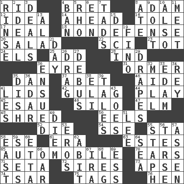 ACROSS 1. To free from 4. Cy Young winner Saberhagen 8. First of billions? 12. It may be bright or harebrained 14. Having the leading position 16. Lacquered or enameled metalware 17. Be tempered by heat 18. Unrelated to defense, as in spending 20. First course 22. _-fi 23. Small child 24. Raised railways 25. Increase 28. Working for oneself (abbr.) 30. Jane of fiction 31. Channel Islands abalone 35. Daniel's nick name 37. Collude with 40. Assistant 41. Hats (slang) 42. POW camp 44. Romp 45. Son of Isaac 46. Grain storage tower 47. Shade tree 48. Fragment 50. Snakelike fish 52. Pass on 54. Compass dir. 55. R.R. building 58. Compass dir. 61. Epoch 63. _____ Park, CO 65. Car 70. Hearing organs 71. Bristle 72. Male parents of animals 73. Domed church section 74. Russian ruler of old 75. Labels 76. Layer DOWN 1. Wash lightly 2. Perfect 3. Allots cards 4. Forbid 5. 17th letter of the Greek alphabet 6. Car or cant ending 7. Bits 8. Had dinner 9. Do not 10. In addition 11. Confront 13. Wing 15. Tenth: prefix 19. A pale, very dry sherry 21. 24 hours 26. To be drawn or hauled along 27. Alight from a bus 29. Window treatments 30. Followed as a consequence or result 32. Place where flour is made 33. Dutch treat 34. Marina Del _, California 35. Food container 36. The sixth month of the Jewish calendar 38. Connecticut Ivy Leaguer 39. Lies 41. French article 43. Leaves 49. South Vietnam president (1954) 51. Area sheltered from the wind 53. Greek god of love 55. Staphylococcus 56. Laconic 57. NE Netherlands city 58. Compass direction 59. Takes to court 60. Singer James 62. "This won't hurt ____!" 64. Ocean 66. Boat paddle 67. Retirement account (abbr.) 68. Part of a journey 69. Double-curved letter
