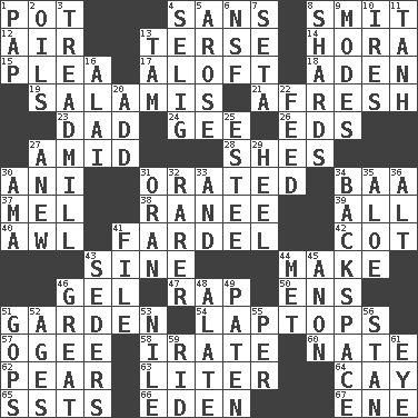 ACROSS 1. Cooking vessel 4. Without 8. Stricken, poetically 12. Atmosphere 13. Laconic 14. Israeli folk dance 15. Entreaty 17. Upward 18. An important port of Yemen 19. Deli grouping 21. Anew 23. Male parent 24. Turn to the right 26. Begley and Asner 27. Among 28. "______ My Girl" (Turtles hit) 30. Black tropical American cuckoo 31. Declaimed 34. Sound made by sheep 37. Cartoonist voice _ Blanc 38. The wife of a rajah (variant) 39. 100% 40. Leather borer 41. Pack 42. Small bed 43. Trig term 44. Cause to be 46. Set 47. Reproach for some lapse or misdeed 50. Followers of ems 51. Place where plants grow 54. Portable computers 57. Double curve, resembling the letter S 58. Feeling or showing extreme anger 60. Nathan's nickname 62. Lightbulb-shaped fruit 63. 61 cubic inches 64. Island 65. Fast planes 66. Genesis locale 67. Compass dir. DOWN 1. Infant food 2. Petroleums 3. Excercise machine 4. Major League Baseball Commissioner Bud 5. Came up 6. Science/research agcy. 7. Stalk of a moss capsule 8. Pottery fragments 9. Methods 10. Angers 11. Hyperbolic tangent 13. Scottish cap 16. Jai ____ 20. Find the sum of 22. Nourish 25. First name in cosmetics 27. Afresh 29. Person who is morally reprehensible 30. Housemaid (var.) 31. NW Algerian seaport 32. More uncommon 33. Plus 34. Keyboard key 35. Medicinal plant 36. Keyboard modifier key 41. Do some clerical work 43. Spring feasts 44. Was introduced to 45. At once, immediately (arch.) 46. Relatively large 48. Having winglike extensions 49. Eucharist need 51. Republicans 52. Matures 53. The longest river in the world 55. For each 56. Comedian Laurel of Laurel & Hardy 59. To free from 61. Sight organ