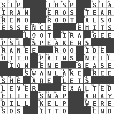 ACROSS 1. Small drink 4. Cook's measure (abbr.) 8. R.R. building 11. SW Asia republic 13. Greek god of love 14. Pull into pieces 15. Former U.S. Attorney General Janet 16. Carrot, for example 17. In addition 18. Center 21. Sends forth 22. Spoils 23. Lyricist Gershwin 25. Turn to the right 26. 23rd letter of the Greek alphabet 29. Orators 32. Indian princess (variant) 34. Friend of Pooh 35. Binary compound 38. Von Bismarck 39. Aches 41. 1994 drama film starring Jodie Foster 43. Electrically charged atom 44. Compass dir. 45. Gospel singer Marvin 46. Tchaikovsky ballet 50. To separate or throw off 51. A female animal or person 54. "We ___ not amused" (Victoria) 55. Allows 57. Crowbar 59. Honored 63. Writer Wiesel 64. Fastener 67. Like ___ of sunshine 68. Deli pickle 69. Seaweed 70. Past tense of be (plural) 71. Mayday 72. "Tell ____ the Marines!" 73. Conclude DOWN 1. Male parent of an animal 2. Angers 3. Baking dishes 4. Cylindrical with tapered ends 5. Sis' sibling 6. "Barney Miller" actor Jack 7. Pacific Standard Time (abbr.) 8. Major League Baseball Commissioner Bud 9. Clothes sense 10. Came up 12. Christmas carol 14. Scottish cap 19. Sense of smell 20. Police officer (slang) 21. Hearing organ 23. Picture 24. Vintage cars 26. Adept person 27. Suttee (variant) 28. To the inside or interior of 30. Satellite of Uranus 31. Trig term 33. Immeasurably long periods of time 36. Letter starter 37. Otherwise 39. Lightbulb-shaped fruit 40. Queen of England 1702-14 42. Area sheltered from the wind 45. Bristle 47. Armed conflict 48. City in Syria 49. A weed 51. Bobsleighs 52. Sun: prefix 53. Vices 56. Cole _ (cabbage dish) 58. Snakelike fish 60. Family _ (genealogy) 61. Merit 62. Colored 64. What Jean-Claude Killy likes to do 65. Remaining after all deductions 66. The first octave above the treble staff