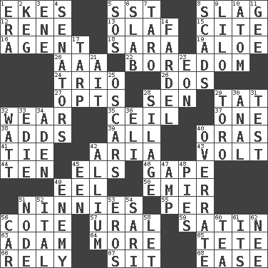ACROSS 1. Makes supply last 5. Fast jet (abbr.) 8. Volcanic refuse 12. French philosopher Descartes 13. Norwegian king 15. Quote 16. Rep 18. "Two Mules for Sister ____" 19. Medicinal plant 20. Auto club (abbr.) 22. Mood resulting from idleness 24. Musical group of three 26. Two (Sp.) 27. Chooses 28. Elected rep. 29. Make lace 32. Erode 35. To provide with a ceiling 37. Single 38. Sums up 39. 100% 40. Mouths or openings 41. Neckwear 42. Roberta Peters solo 43. Electrical Unit 44. "___ Little Indians" 45. Raised railways 46. Yawn 49. Snakelike fish 50. Independent ruler or chieftain 51. Simpletons 55. For each 56. ____ d'Azur (French Riviera) 57. Mountain range 59. Smooth fabric 63. First of billions? 64. Greater amount 65. Wig 66. Have trust in 67. Be seated 68. Relaxation DOWN 1. Period 2. Cask 3. Compass dir. 4. Elected representatives 5. Mayday 6. Thick slice 7. Edible starchy tuberous root 8. Large numbers or amounts 9. _ and Stitch 10. Tiny particle 11. Unit of force equal to gravity 14. Pack 17. Canvas cover 21. Small island 23. A really long time 25. Motion picture awards 28. Fodder prepared in a silo 29. "Corrida" creature 30. Of or related to the anus 31. Trial 32. Electrical Unit 33. Singer Brickell 34. Arabian gulf 36. Biblical high priest 40. Make much ado about nothing 42. Plant genus of onion and garlic 45. Car or cant ending 47. Electrical Unit 48. Sliced desserts 49. Foe 51. Connecting point 52. Slanted text style (abbr.) 53. Greek god of love 54. Indian skirt 56. Auto 58. Allow 60. Afternoon social gathering 61. ___ a Wonderful Life 62. Born