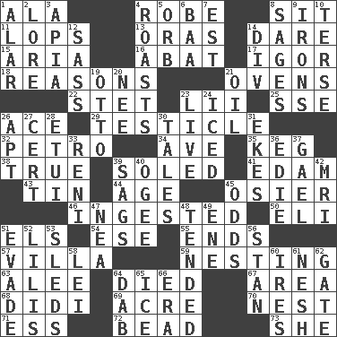 ACROSS 1. Wing 4. Loose flowing garment 8. Be seated 11. Chops off 13. Mouths or openings 14. Have the gumption 15. Roberta Peters solo 16. Blind as ____ 17. Russian composer Stravinsky 18. Thinks logically 21. Baking chambers 22. Proofreading order 23. Cards in a Roman deck? 25. Compass dir. 26. Adept person 29. One of the two male reproductive glands 32. Stone: prefix 34. "___ Maria" 35. Cask 38. Loyal 39. Having a sole or soles 41. Dutch treat 43. Shallow baking pan 44. Grow older 45. Flexible twig of a willow tree 46. Eaten 50. Biblical high priest 51. Raised railways 54. Compass dir. 55. Extremities 57. Country estate 59. Snuggling 63. Toward shelter 64. Passed on 67. Length times width 68. "You Light Up My Life" star Conn 69. Measure of real estate 70. A home for chicks 71. Double-curved letter 72. Necklace unit 73. A female animal or person DOWN 1. Having or resembling wings 2. Old wives' tales, e.g. 3. Capital of Western Samoa 4. Exposes to great heat 5. Globe 6. Sound made by sheep 7. Eastern Standard Time (abbr.) 8. Gurus 9. Removes the wrinkles 10. Laconic 12. Backtalk 14. HTML Container Element 19. Von Bismarck 20. Born 21. Petroleum 23. Moving, as bait 24. On the rocks 26. Fitting 27. Foregone conclusion 28. Needle case 30. Falsehoods 31. Supplements with great effort 33. Painter Guido (1575-1642) 36. Singer Brickell 37. Highlander 39. Droops 40. Double curve, resembling the letter S 42. Medical imaging device (abbr.) 45. Likelihood 47. Teachers' org. 48. Watched over 49. Compass dir. 51. Elude 52. Ms. Damita and namesakes 53. Bobsleighs 56. Comedian Laurel of Laurel & Hardy 58. Luau accessory 60. Angers 61. Tender 62. Yard entry 64. Apply (a substance) by light strokes 65. Frozen water 66. Epoch