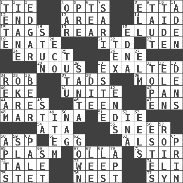 ACROSS 1. Make a knot 4. Chooses 8. Singer James 12. Conclusion 13. Length times width 14. Put down 15. Labels 17. Tail end 18. Dodge 19. Related on the mother's side 21. It would 23. "___ Little Indians" 24. Spew [out] 26. Compass dir. 28. Good sense 30. Glorified 34. Director Reiner 37. Bits 39. Undercover agent 40. Make supply last 41. Join together 43. Baking dish 44. Ancient Greek god of war 46. Adolescent 47. Followers of ems 48. Chrissie's court nemesis 51. Singer Brickell 54. _ moment's notice (2 wds.) 55. Scornful expression 58. Viper 61. Oval reproductive body of a fowl 63. Columnist Joseph or Stewart 65. Suffix with ecto or cyto 67. Water jar 71. Tumult 72. Lie 73. Shed a tear 74. Biblical high priest 75. Proofreading order 76. A home for chicks 77. Symbol (abbr.) DOWN 1. False hair 2. Empty; void 3. _ Allan Poe 4. Rowing implement 5. Before (prefix) 6. Afternoon social gathering 7. Indian skirt 8. Pipe bend 9. Tense 10. Event that recurs at intervals 11. An important port of Yemen 16. Make senseless or dizzy 18. Pulitzer Prize-winning author Ferber 20. Environmental prefix 22. John Ritter's dad 25. Ballerina skirt 27. Shade tree 29. Before Barbara or Clara 30. First name in cosmetics 31. Drink excessively 32. Flair 33. Cub Scout units 34. 480, 500 or 516 sheets of paper 35. Gumbo ingredient 36. Fermented drink made from hops 38. Pass on 42. Extremities 45. R.R. building 49. Detail 50. Tired old horse 52. _ tizzy (2 wds.) 53. Snakelike fish 56. _____ Park, CO 57. Turbulent 58. Flats, for short 59. Narrow board 60. Light colored 62. Woman's formal wear 64. Demure 66. Put into a specified state 68. Area sheltered from the wind 69. French article 70. Fitting