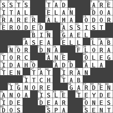 ACROSS 1. Fast planes 5. Small boy 8. "We ___ not amused" (Victoria) 11. Slanted text style (abbr.) 12. Flair 14. ___ good deed 15. More uncommon 17. _ mater 18. Scent 19. Worn away 21. Help 23. Storage container 25. Highlander 26. Toward the sea 27. Pipe bend 28. Experiment locale 31. And not 33. Heredity factor (abbr.) 35. Plants 37. Torque (variant) 38. One (Scot) 40. Cassini of fashion 41. Potato state 43. Increase 45. Insect wing 46. Nine, plus one 47. Make lace 50. SW Asia republic 52. Hankering 53. Keyboard key 54. Refuse to acknowledge 56. Place where plants grow 61. Small Philippine buffalo 62. Small island 65. Miss Universe 1986, Barbara Palacios _ 66. Binary compound 67. Letter starter 68. Washington bills 69. Two (Sp.) 70. Health resort 71. Transmitted DOWN 1. The founder of a family 2. Play the lead 3. Edible starchy tuberous root 4. Downhill vehicle 5. Afternoon social gathering 6. Everything 7. Break 8. Does sums 9. Carrot, for example 10. Hearing organ 13. Relating to the nose 16. Confederate soldiers (slang) 18. Lubricate 20. Passed on 22. Oneself 24. Nanny 26. Bowlike part 28. Hang loosely or laxly 29. Type of rug 30. Container for groceries 31. Connecting point 32. NW Algerian seaport 34. Santa ___, CA 36. Grant temporary use of 37. Teat (slang) 39. Prepare for publication 42. "Beetle Bailey" pooch 44. To trail on the ground 48. Sour-tasting 49. College papers 51. Blind as ____ 52. _ tizzy (2 wds.) 54. Southeast Asian peninsula 55. Moves 57. Vintage cars 58. Unit of force 59. Genesis locale 60. Egg locale 61. Help 63. Pet locale 64. Epoch