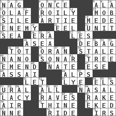 ACROSS 1. Tired old horse 4. Single time 8. According to 11. Norwegian king 13. Turbulent 15. Disorderly crowd 16. Filth; sediment 17. Nick name for Arthur 18. Ancient Persian 19. Foe 21. Snakelike fish 22. A single undivided whole 23. Ocean 24. Period 27. French article 29. Toward the sea 30. Debunk (Brit. slang) 34. Small child 36. NW Algerian seaport 39. Showing deterioration from age 40. Billionth: prefix 41. Underwater navigation system 43. Family _ (genealogy) 44. Make improvements or corrections to 46. Nathan's nickname 47. Compass dir. 48. Slender Brazilian palm 49. High mountains 51. Allow 53. Sodium hydroxide 54. Raised railways 57. Mountain range 60. Everything 63. Rhinal 65. Made of lace 66. All-night dance parties 69. Immoral or dissolute person 70. Atmosphere 71. One or ones belonging to thee 72. Made supply last 73. Compass dir. 74. Travel on or in a vehicle 75. Big collection agency DOWN 1. Olfactory organs 2. Place in a line 3. An organ shaped like a helmet 4. Mouth or opening 5. Not either 6. Quote 7. Writer Wiesel 8. So be it 9. Farming town in central California 10. Collude with 12. Opposite of masc. 14. Shout 18. French bagpipes 20. Consenting reply 25. Vintage cars 26. Composer Copland 28. Begley and Asner 29. Without tonality 31. Drinking establishments 32. Toward shelter 33. Unit of force equal to gravity 34. Scottish caps 35. Singles 37. Santa ___, CA 38. Relating to or accompanying birth 40. Teachers' org. 42. Trust 45. Pass on 50. Animal enclosure 52. Small pie 54. 1973 Nobel Price Winner (Physics) Leo 55. Member of a famous L.A. basketball team 56. Bobsleighs 57. ____ Bator, Mongolia 58. Water falling in drops from the sky 59. 43,560 square feet 61. Cowardly lion portrayer 62. 57 in ancient Rome 64. "We ___ not amused" (Victoria) 67. Conclude 68. Observe