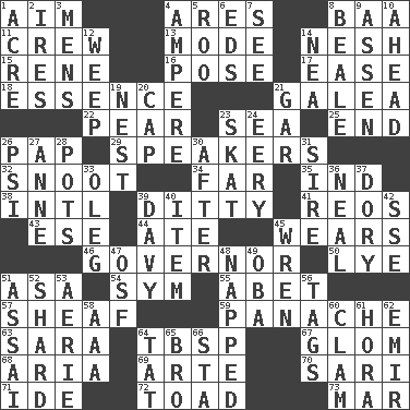 ACROSS 1. Direct toward a target or goal 4. Ancient Greek god of war 8. Sound made by sheep 11. Group working together 13. Method 14. Soft 15. French philosopher Descartes 16. Airs 17. Comfort 18. Center 21. An organ shaped like a helmet 22. Lightbulb-shaped fruit 23. Ocean 25. Conclude 26. Infant food 29. Orators 32. Snout, nose 34. Distant 35. Working for oneself (abbr.) 38. International (abbr.) 39. Simple song 41. Vintage cars 43. Compass dir. 44. Had dinner 45. Erodes 46. Head of state? 50. Sodium hydroxide 51. White ___ sheet 54. Symbol (abbr.) 55. Collude with 57. To gather and bind into a bundle 59. Flamboyance 63. "Two Mules for Sister ____" 64. Cook's measure (abbr.) 67. Take by theft 68. Operatic vocal solo 69. Johnson of "Laugh-In" 70. Indian skirt 71. Binary compound 72. Frog relative 73. Make imperfect DOWN 1. Measure of real estate 2. Angers 3. Not women's 4. Electrical Unit 5. Friend of Pooh 6. Begley and Asner 7. Observe 8. Calif. Air Force Base 9. NE Netherlands city 10. Having the leading position 12. Shed a tear 14. Teachers' org. 19. A home for chicks 20. Head covering 21. Slender fish 23. Three-handed card game 24. Suggestive of the supernatural 26. Air pressure measure (abbr.) 27. Queen of England 1702-14 28. Plant holders 30. Following 31. Male parent of an animal 33. Cassini of fashion 36. Anneal 37. Dinghy 39. _ Jones' Locker 40. A distinct part 42. Compass dir. 45. Songbird 47. Order of Saint Francis (abbr.) 48. Slept 49. Chief or king in Benin or Nigeria 51. Slender Brazilian palm 52. Pottery fragment 53. Nest on high 56. Labels 58. Auto club (abbr.) 60. Burrowing marine mollusk 61. Israeli folk dance 62. Arab leader 64. Make lace 65. Sis' sibling 66. R.R. building